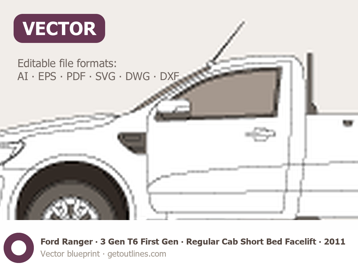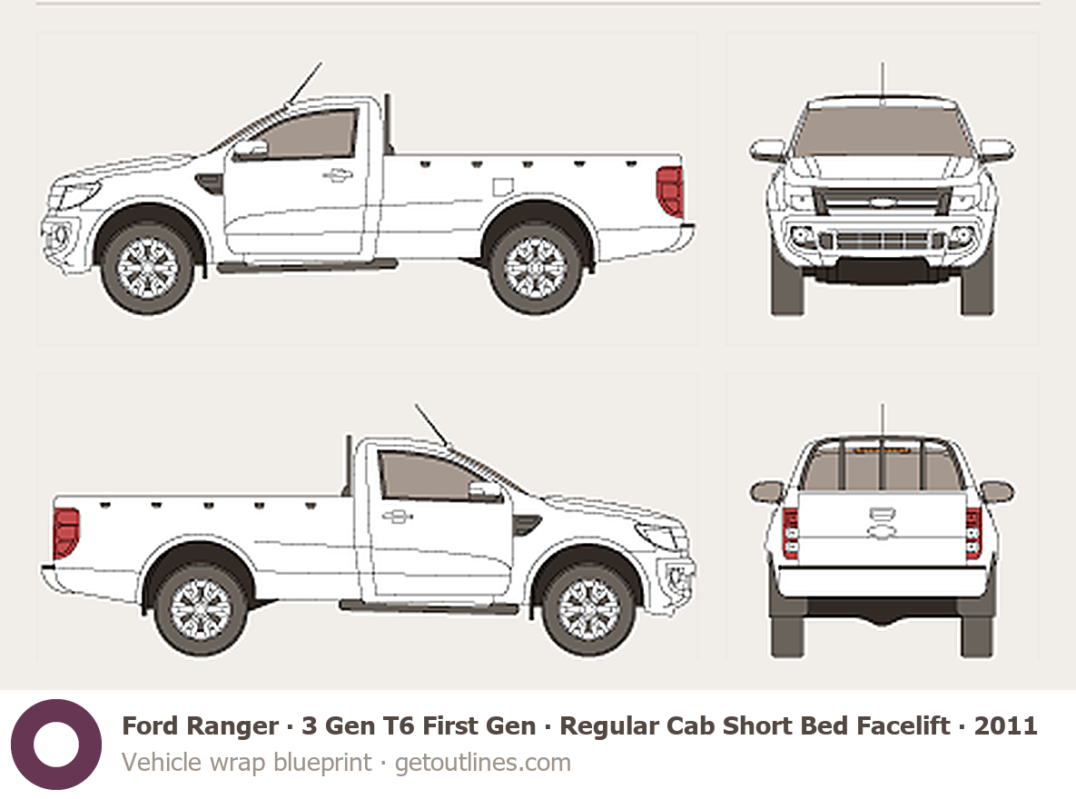 This 2011 Ford Ranger 3 Gen T6 First Gen Regular Cab Short Bed Facelift Pickup Truck blueprint helps designers, wrap studios, and 3D artists simplify their workflow and save valuable time for creative work instead of routine tasks.