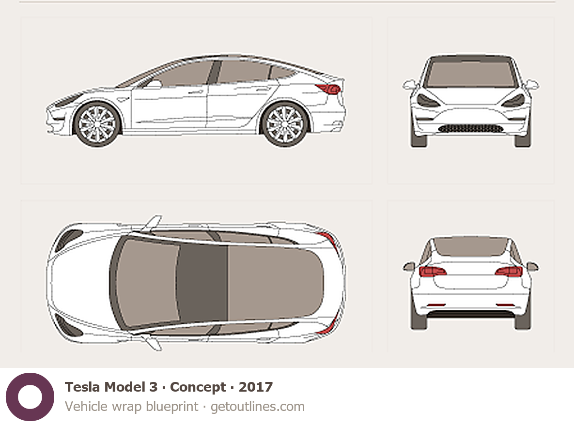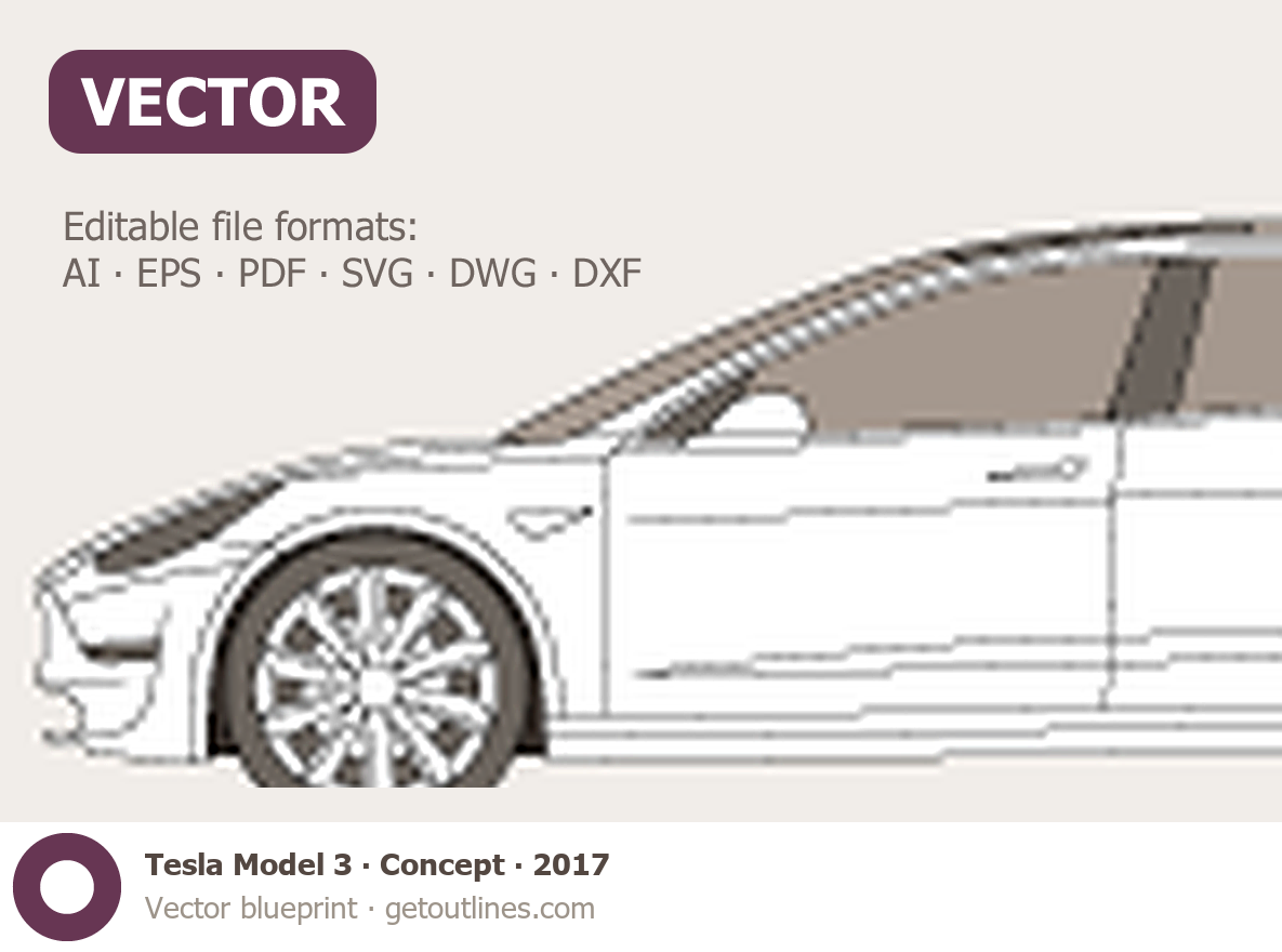 Buy this Tesla Model 3 Concept blueprint and line drawing in high-quality editable vector file formats. Best for 3D and car wrap design.