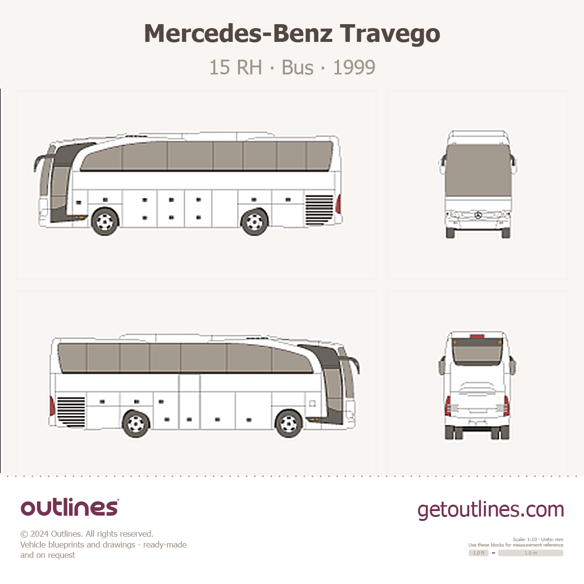 This 1999 Mercedes-Benz Travego 15 RH Bus blueprint helps designers, wrap studios, and 3D artists simplify their workflow and save valuable time for creative work instead of routine tasks.