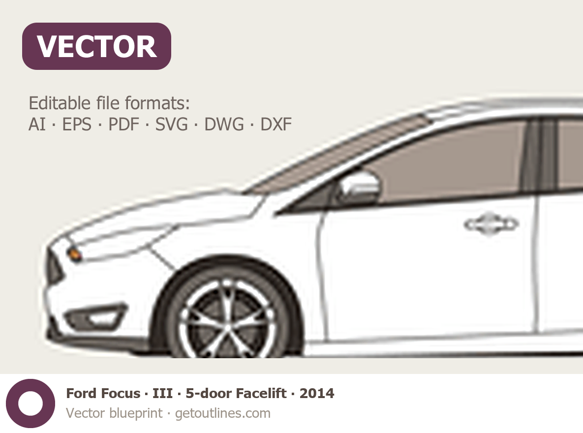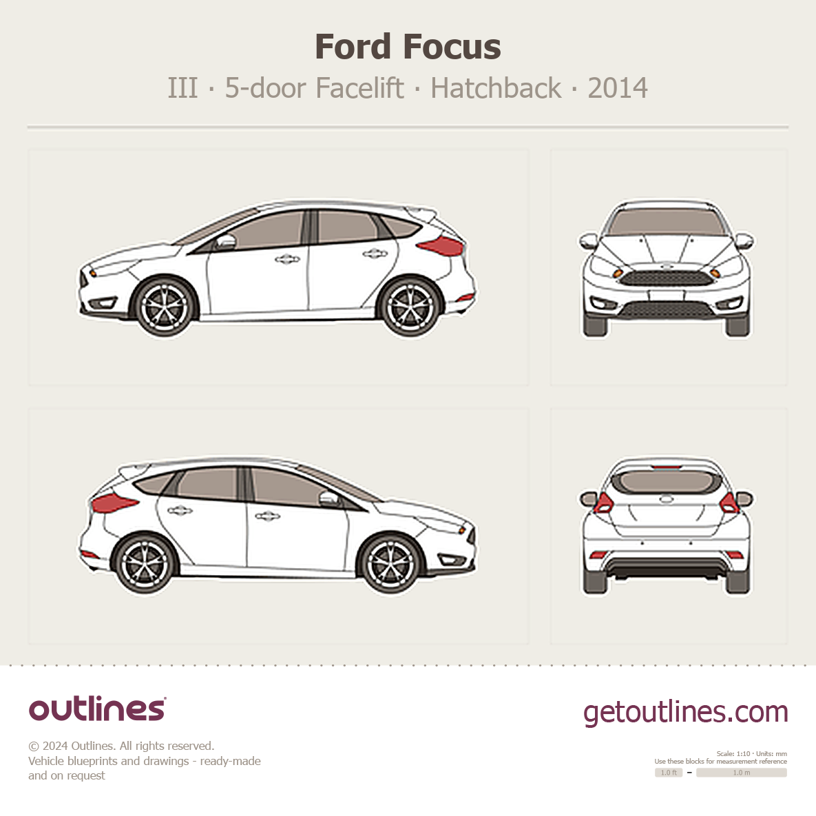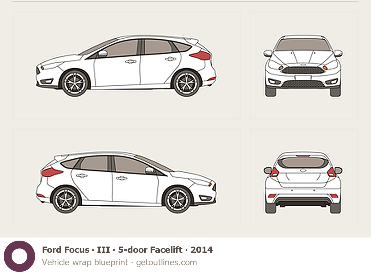 This 2014 Ford Focus III 5-door Facelift Hatchback blueprint helps designers, wrap studios, and 3D artists simplify their workflow and save valuable time for creative work instead of routine tasks.