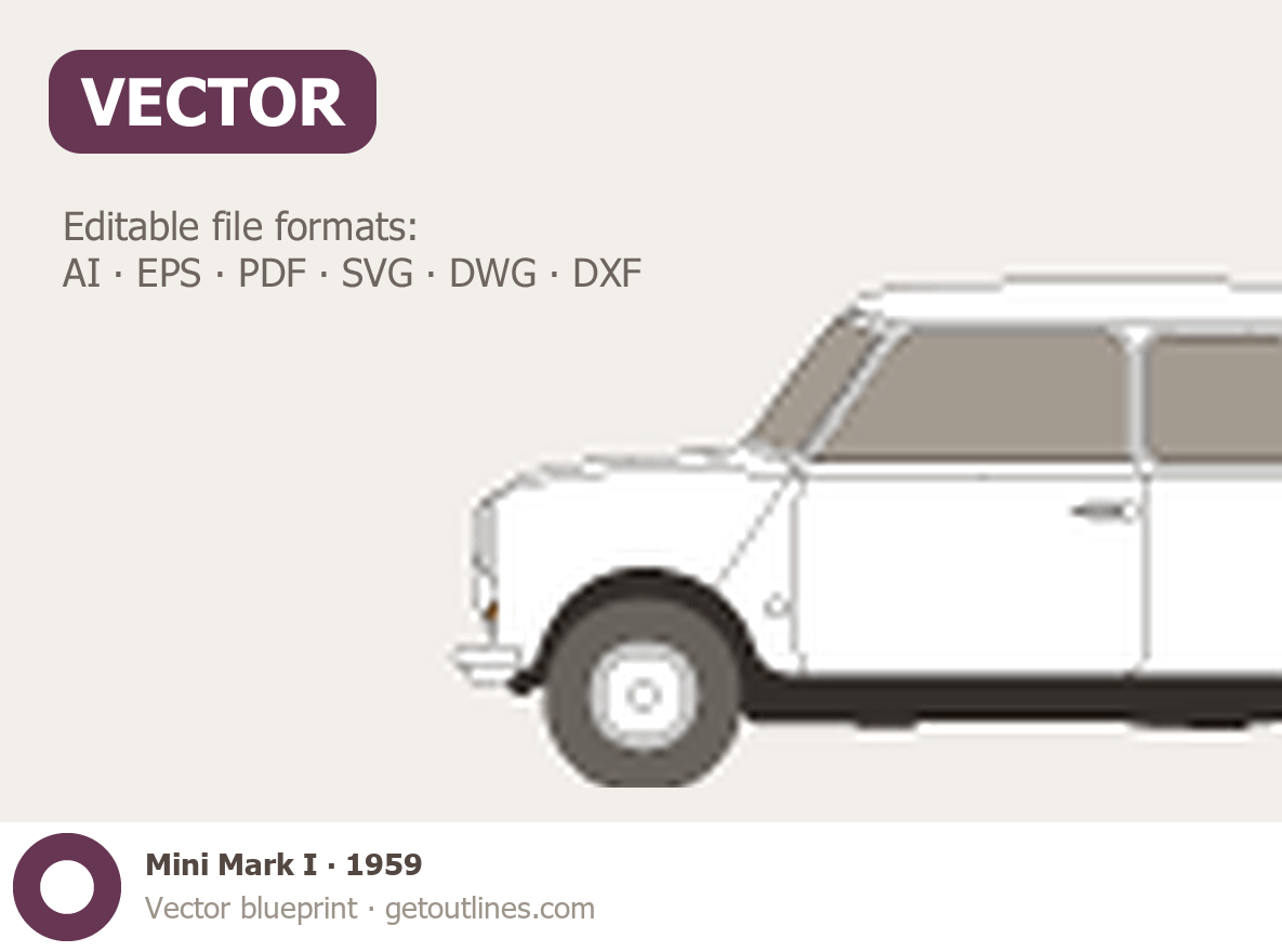This template is suitable for Mini Mark I models from 1959 to 1967, including 1959, 1960, 1961, 1962, and 1967 model years, and is commonly used for vehicle wrap and signage design.