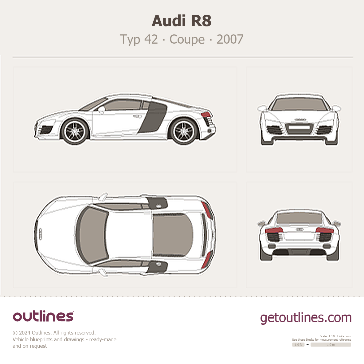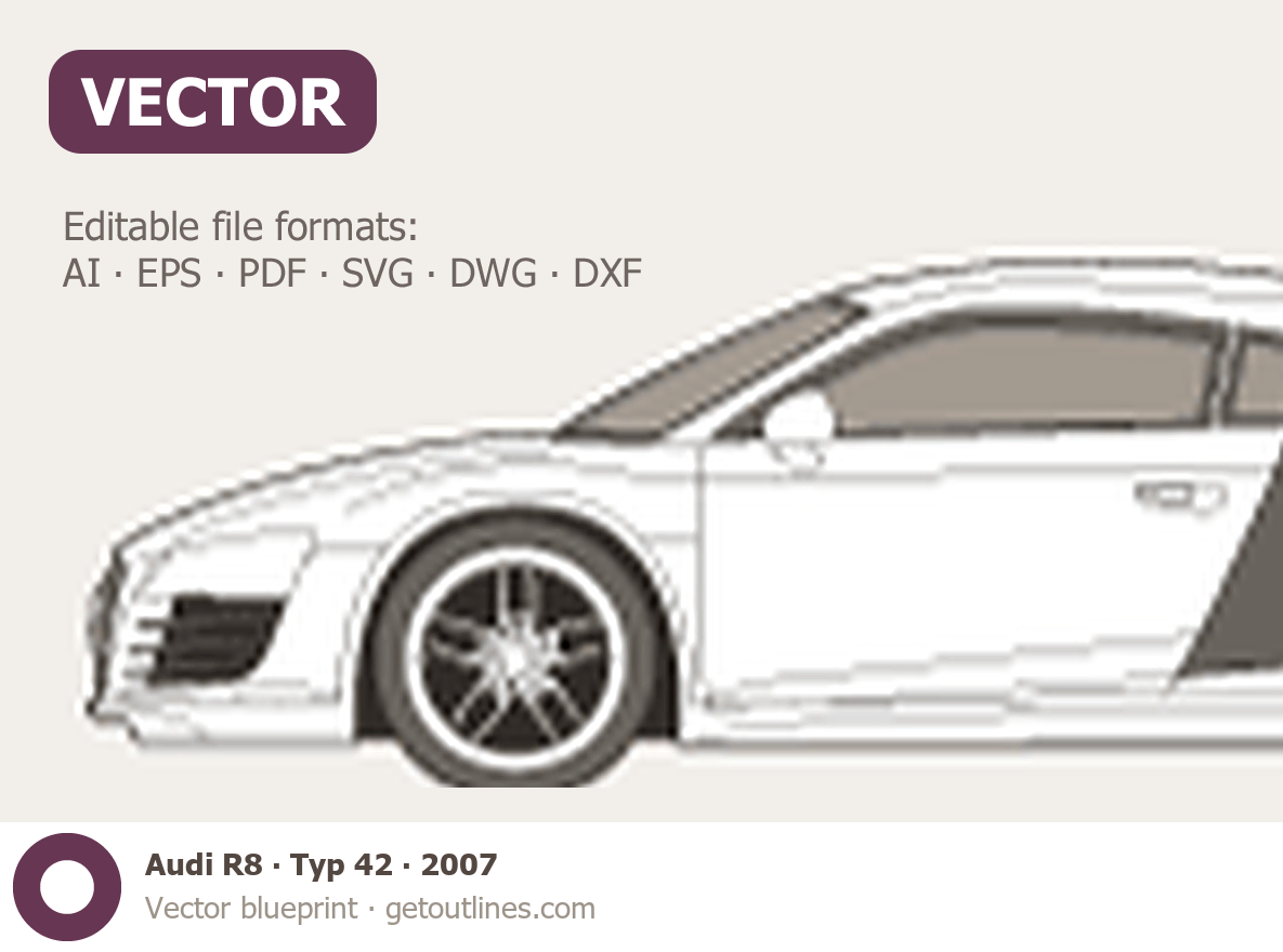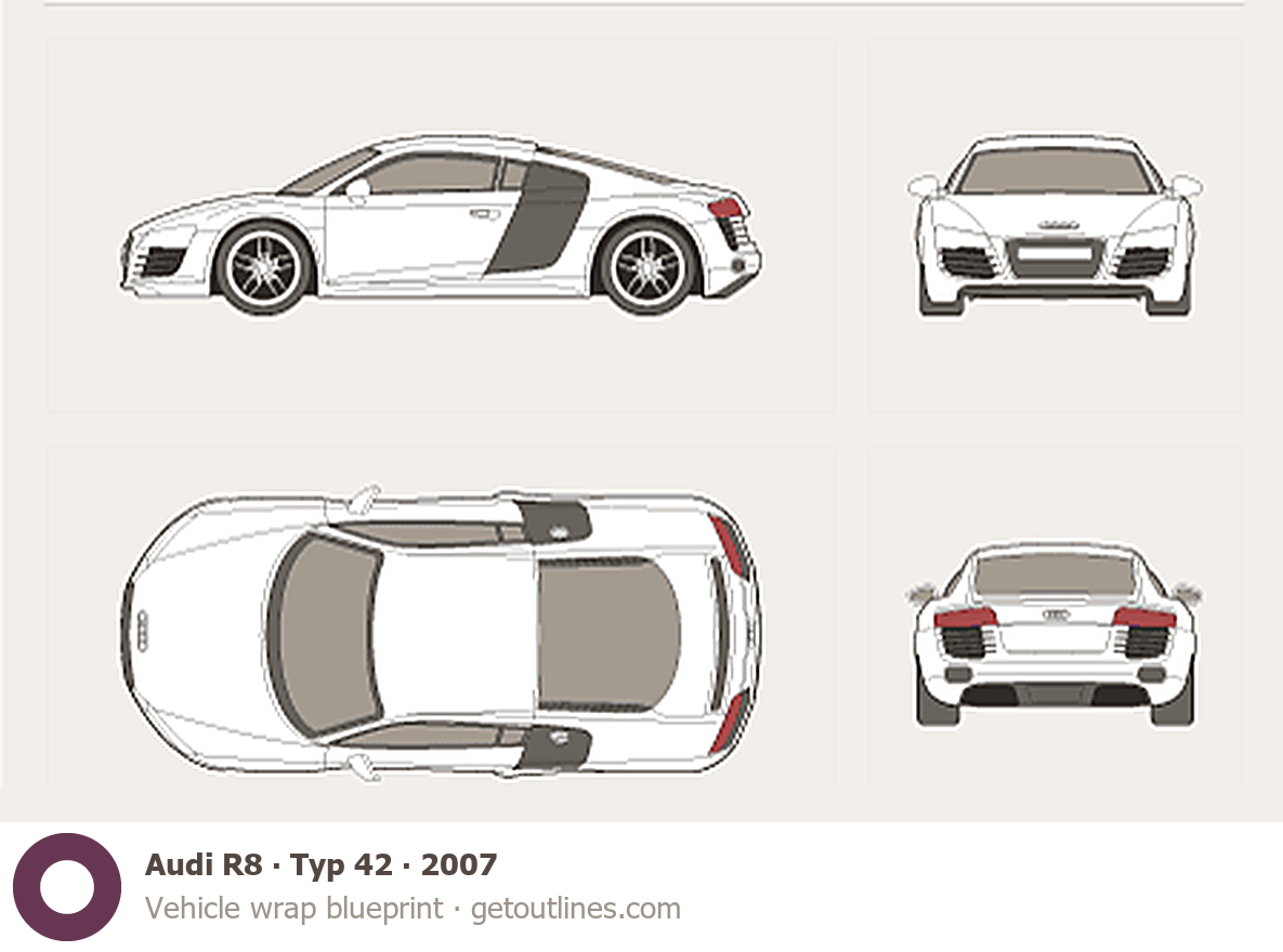 This 2007 Audi R8 Typ 42 Coupe blueprint helps designers, wrap studios, and 3D artists simplify their workflow and save valuable time for creative work instead of routine tasks.