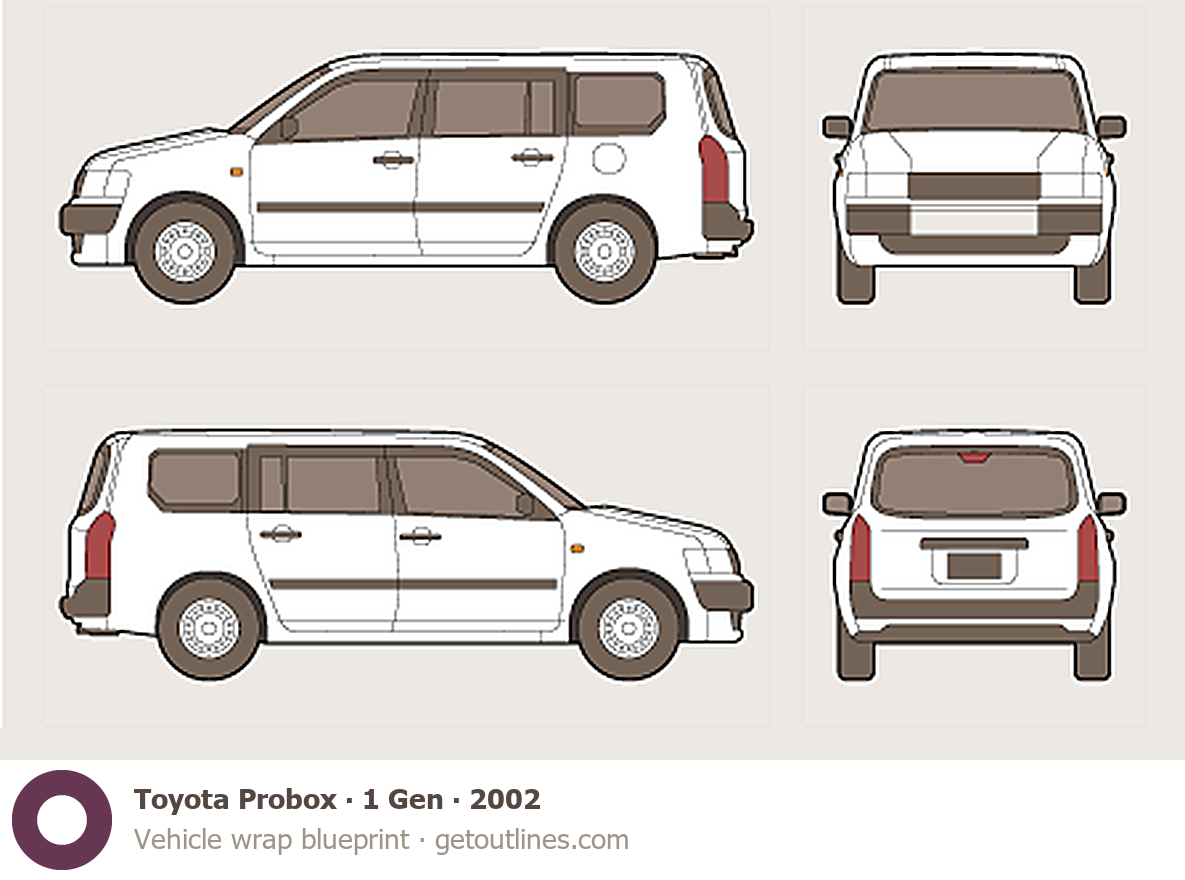 This template is suitable for Toyota Probox models from 2002 to 2014, including 2002, 2003, 2004, 2005, and 2014 model years, and is commonly used for vehicle wrap and signage design.