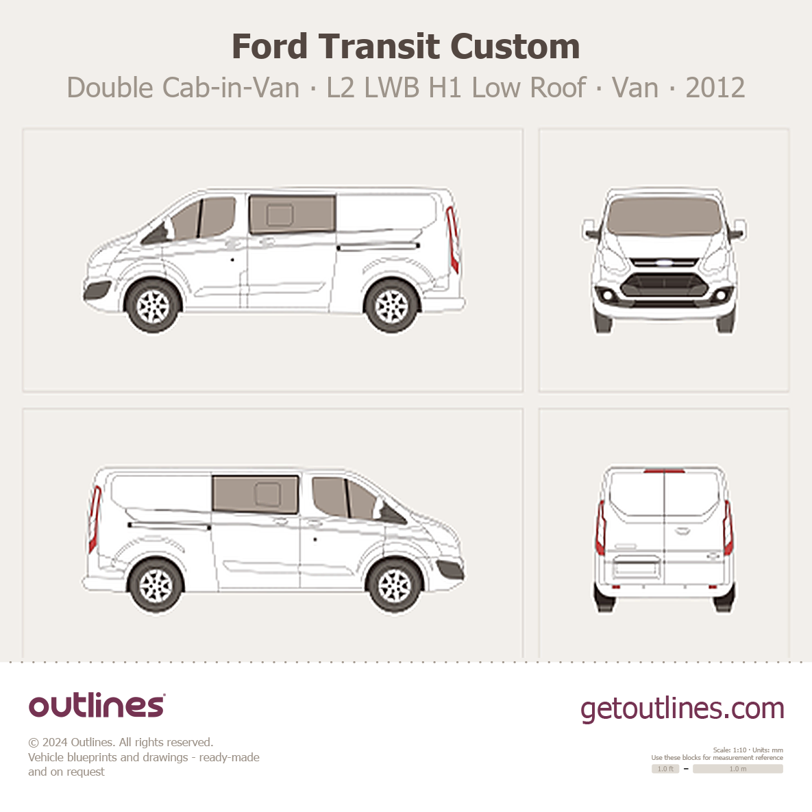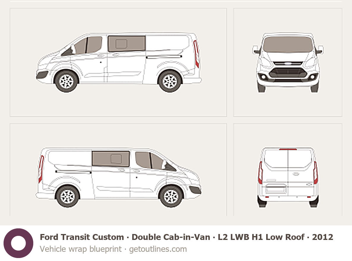 This 2012 Ford Transit Custom Double Cab-in-Van L2 LWB H1 Low Roof Van blueprint helps designers, wrap studios, and 3D artists simplify their workflow and save valuable time for creative work instead of routine tasks.