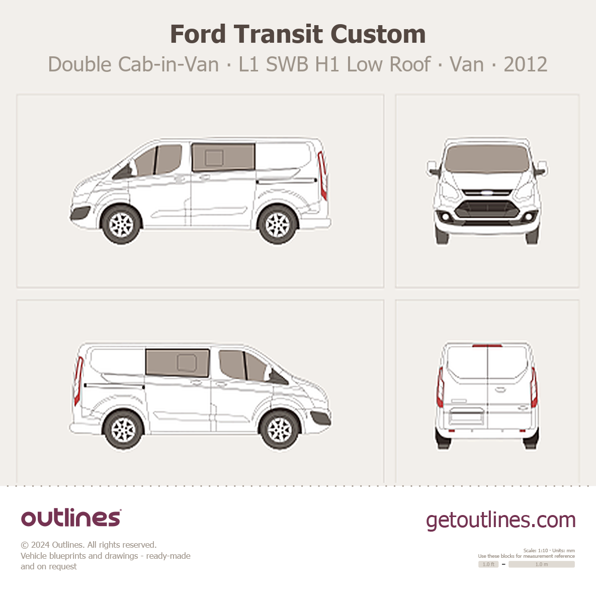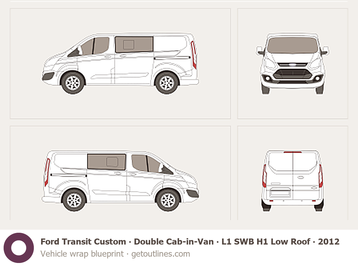 This 2012 Ford Transit Custom Double Cab-in-Van L1 SWB H1 Low Roof Van blueprint helps designers, wrap studios, and 3D artists simplify their workflow and save valuable time for creative work instead of routine tasks.