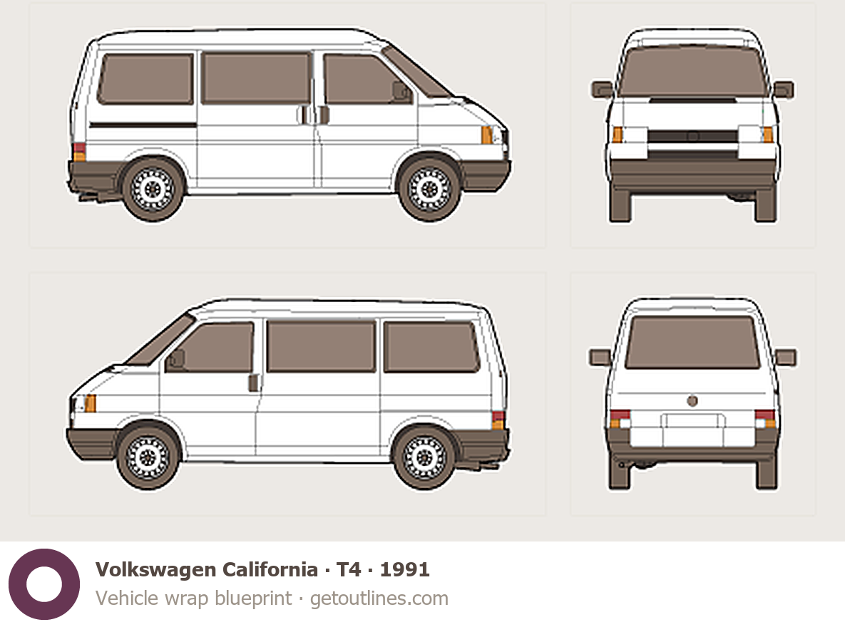 This template is suitable for Volkswagen California models from 1991 to 1996, including 1991, 1992, 1993, 1994, and 1996 model years, and is commonly used for vehicle wrap and signage design.
