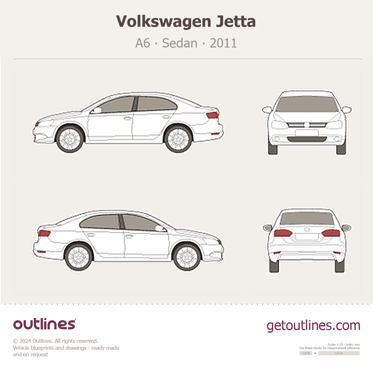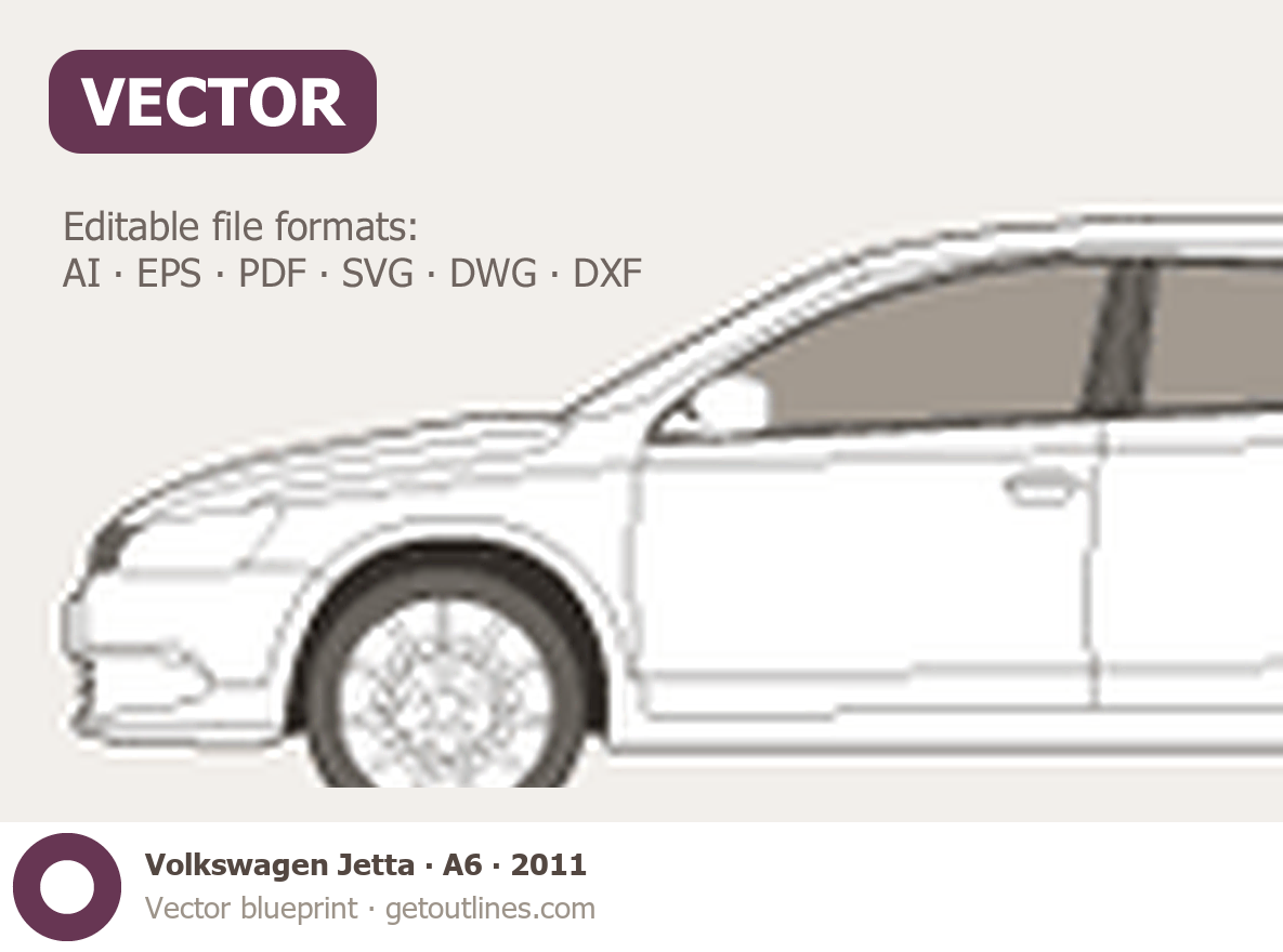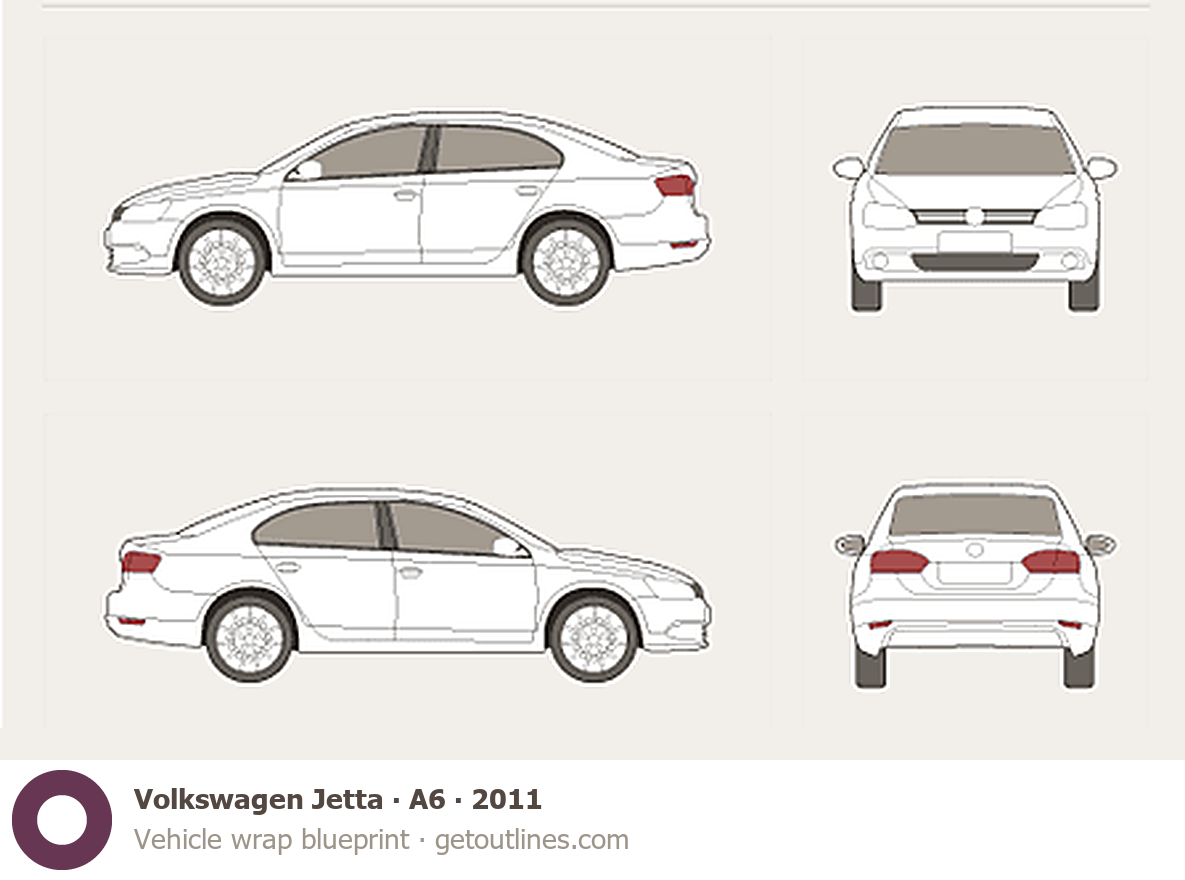 This 2011 Volkswagen Jetta A6 Sedan blueprint helps designers, wrap studios, and 3D artists simplify their workflow and save valuable time for creative work instead of routine tasks.