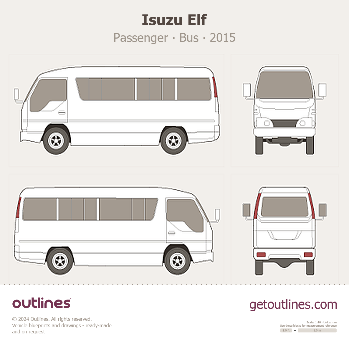 This is a blueprint of the Elf, produced by carmaker Isuzu in 2015 - Present (2025, 2026). It features a Bus body design and is classified as a Commercial vehicle.