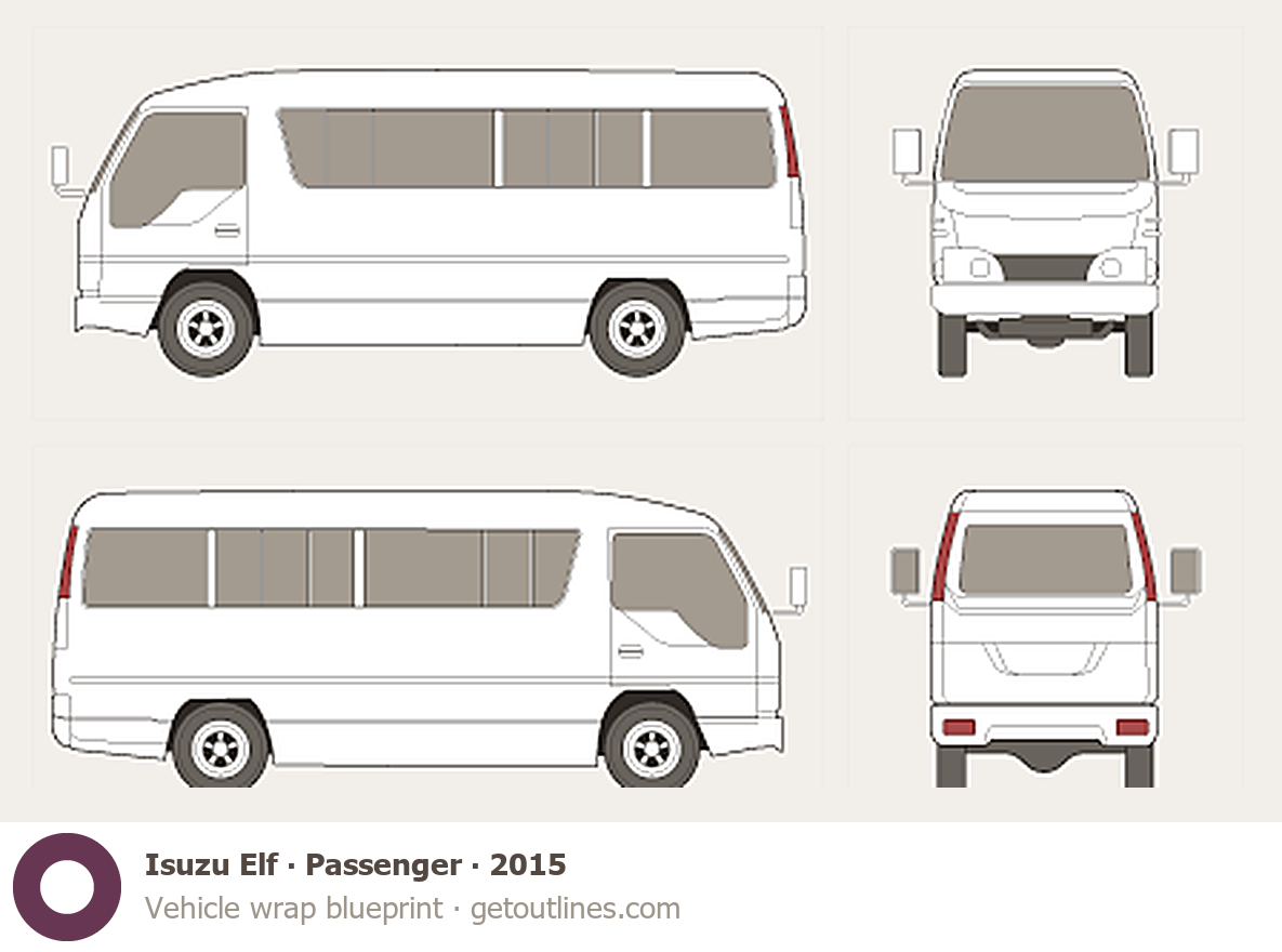This 2015 Isuzu Elf Passenger Bus blueprint helps designers, wrap studios, and 3D artists simplify their workflow and save valuable time for creative work instead of routine tasks.