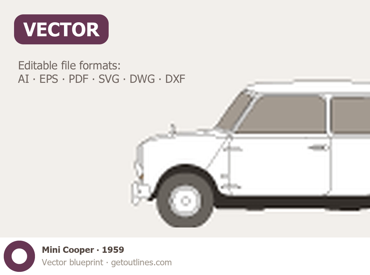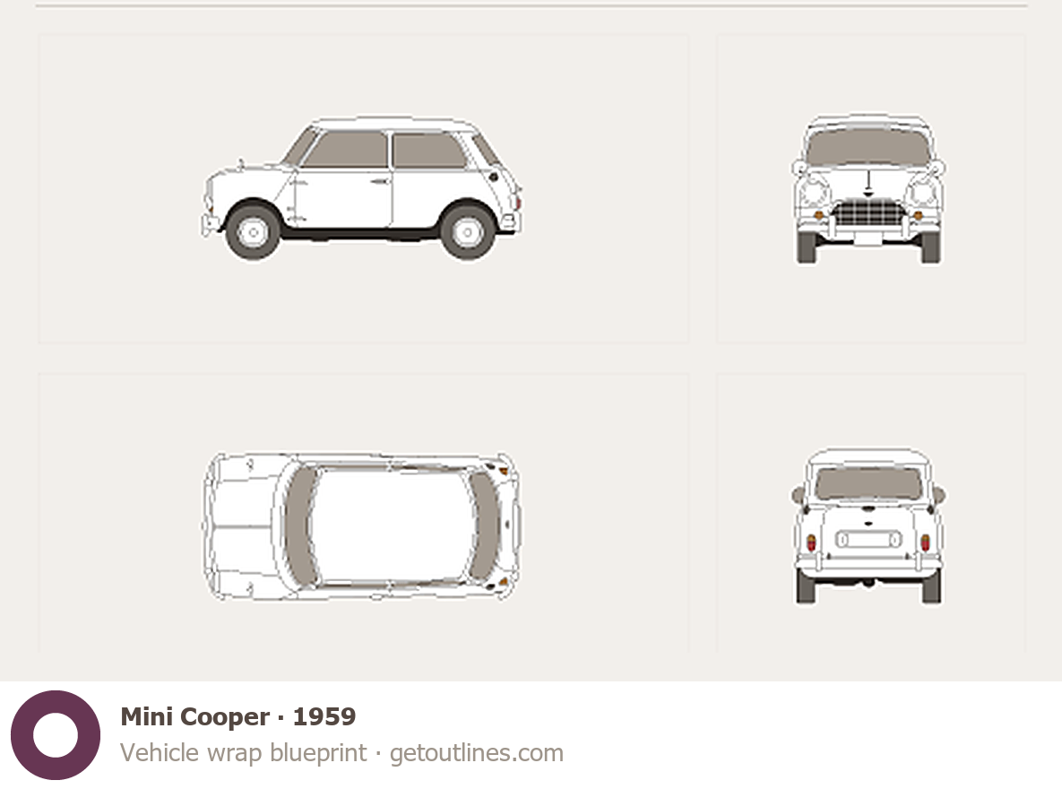This 1959 Mini Cooper Hatchback blueprint helps designers, wrap studios, and 3D artists simplify their workflow and save valuable time for creative work instead of routine tasks.