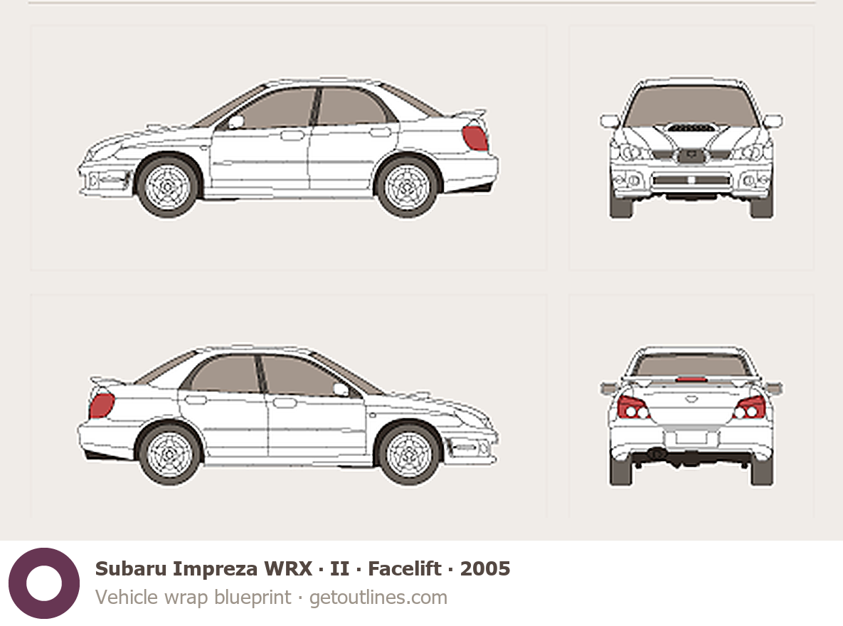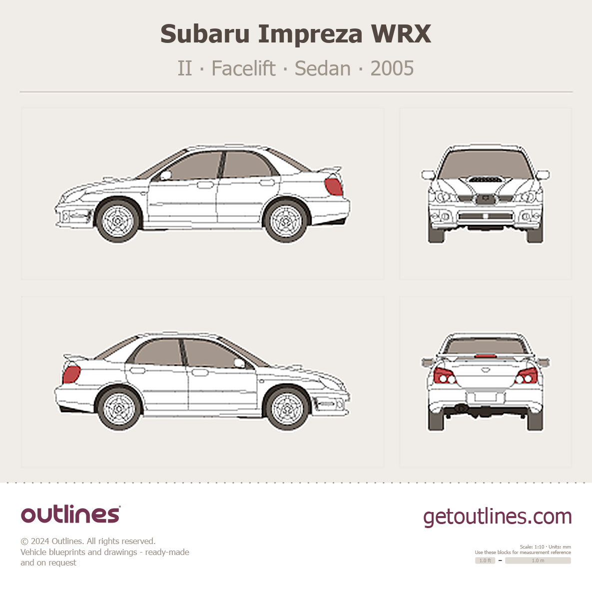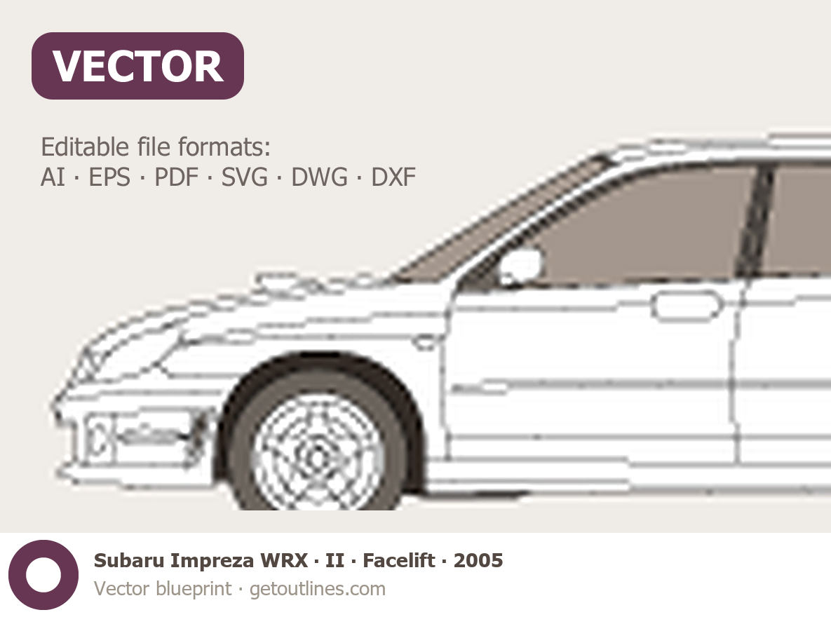 Buy this Subaru Impreza WRX II blueprint and line drawing in high-quality editable vector file formats. Best for 3D and car wrap design.