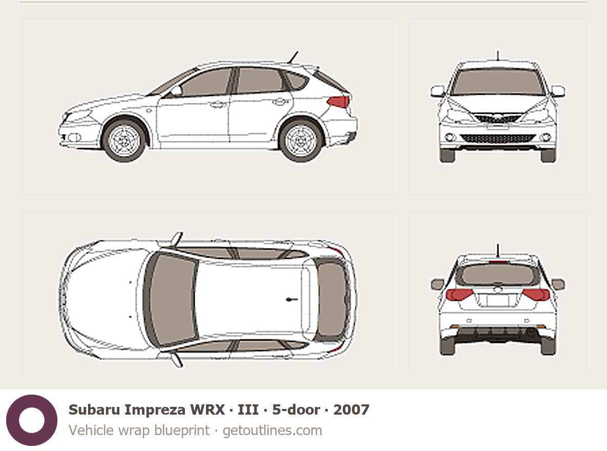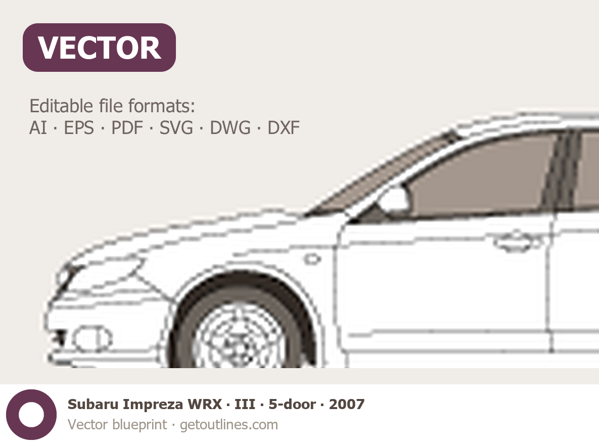 Buy this Subaru Impreza WRX III blueprint and line drawing in high-quality editable vector file formats. Best for 3D and car wrap design.
