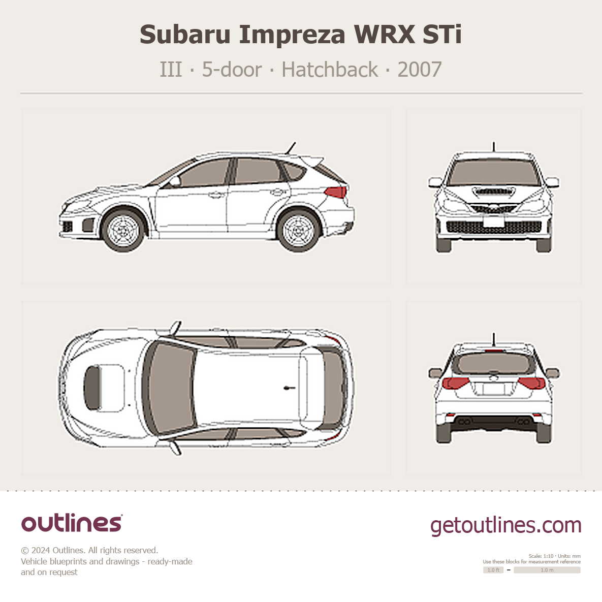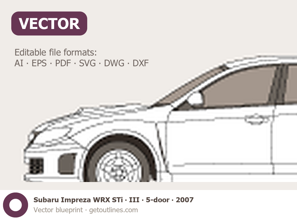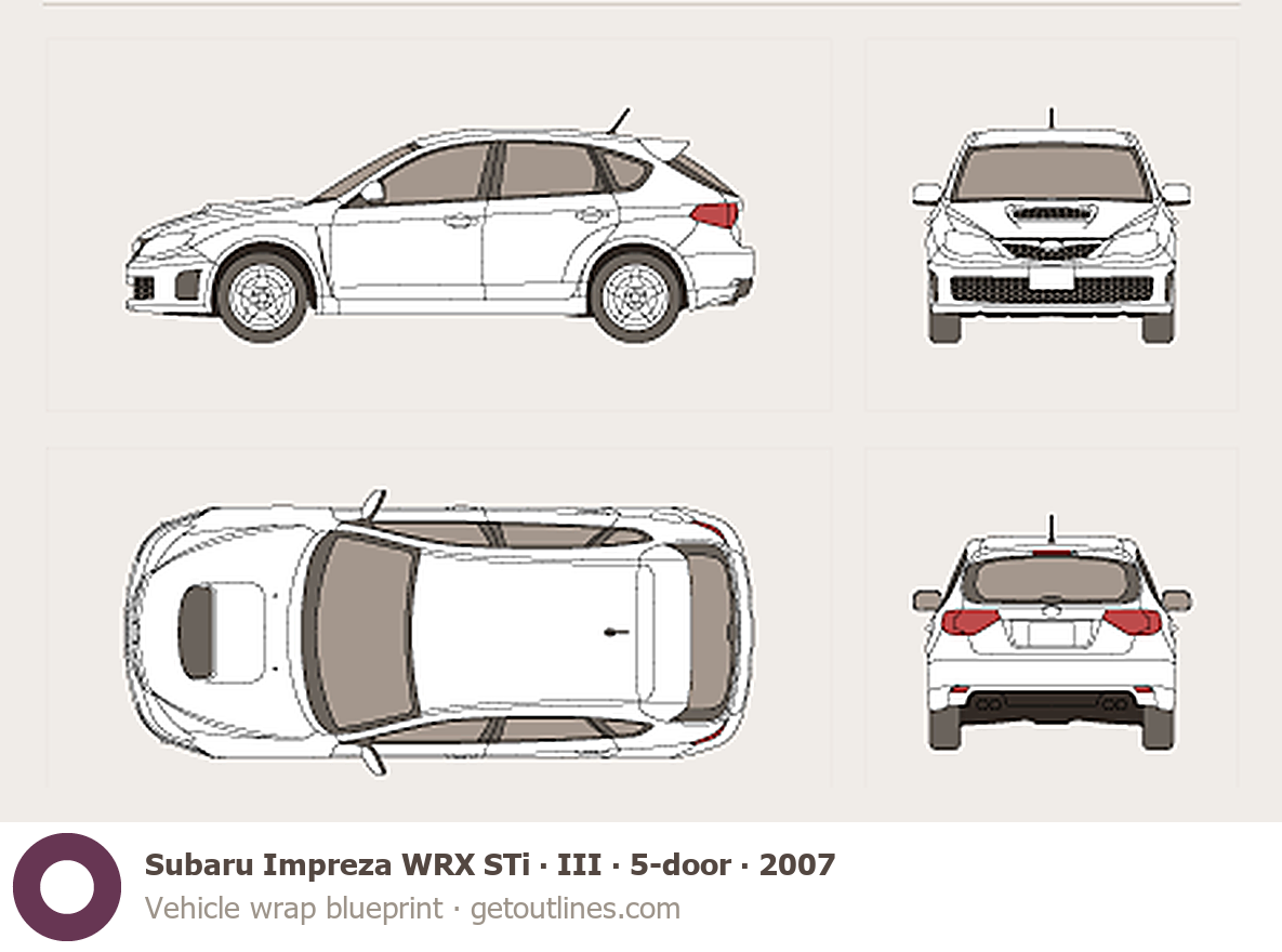 This 2007 Subaru Impreza WRX STi III 5-door Hatchback blueprint helps designers, wrap studios, and 3D artists simplify their workflow and save valuable time for creative work instead of routine tasks.