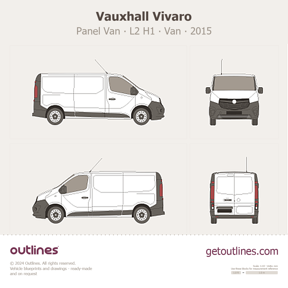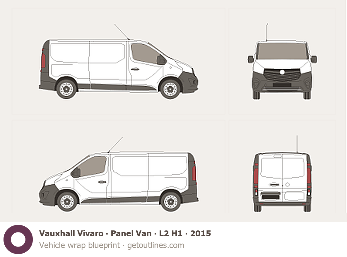 This 2015 Vauxhall Vivaro Panel Van L2 H1 Van blueprint helps designers, wrap studios, and 3D artists simplify their workflow and save valuable time for creative work instead of routine tasks.