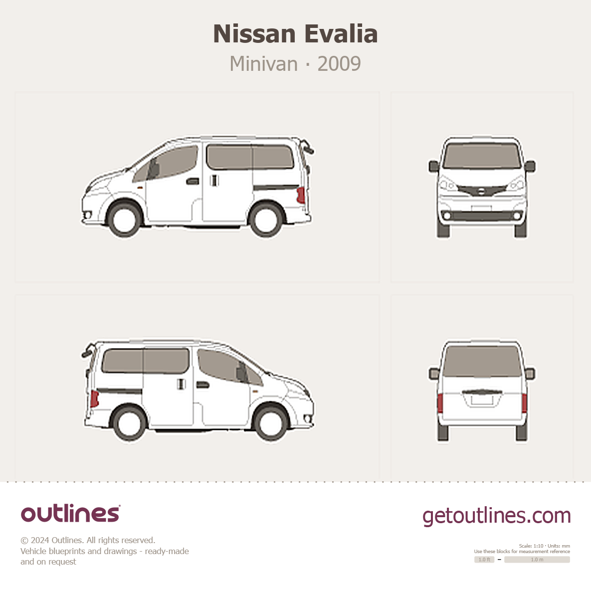 This is a blueprint of the Evalia, produced by carmaker Nissan in 2009 - Present (2025, 2026). It features a Minivan body design and is classified as a Commercial vehicle.
