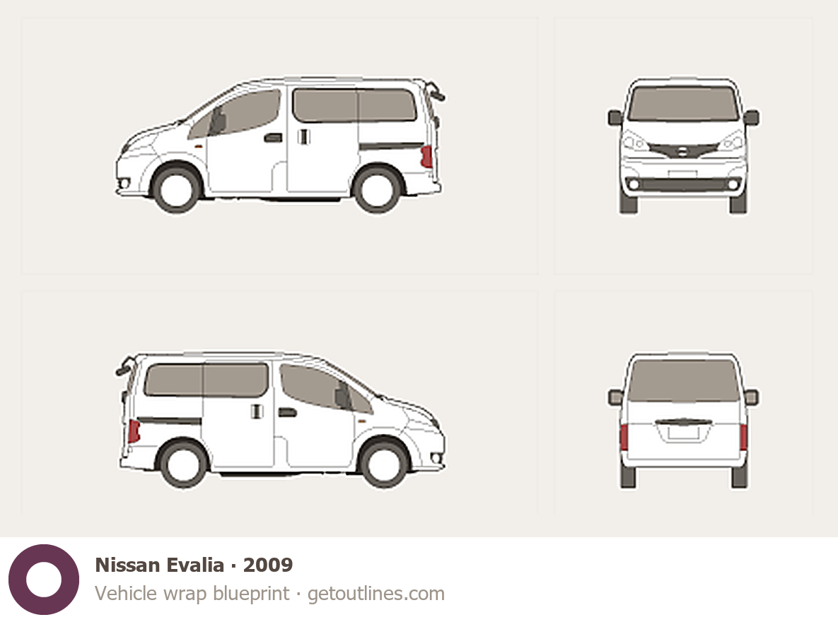 This template is suitable for Nissan Evalia models from 2009, including 2009, 2010, 2011, 2012, and 2023 model years, and is commonly used for vehicle wrap and signage design.