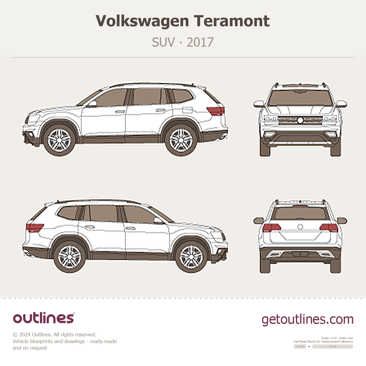 This is a blueprint of the Teramont, produced by carmaker Volkswagen in 2017 - Present (2025, 2026). It features a SUV body design and is classified as a Crossover vehicle.