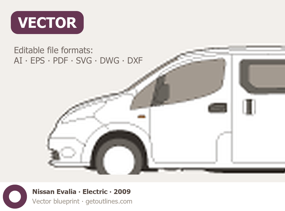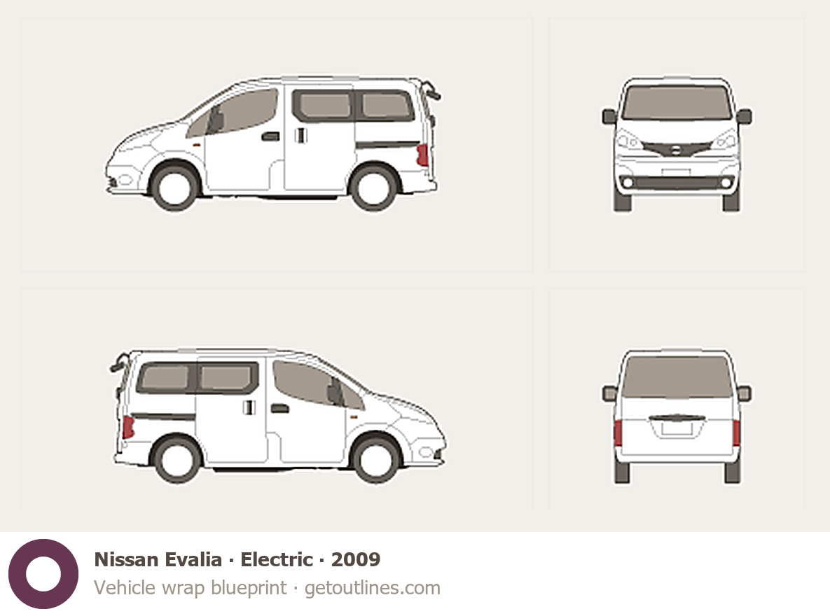 This 2009 Nissan Evalia Electric Minivan blueprint helps designers, wrap studios, and 3D artists simplify their workflow and save valuable time for creative work instead of routine tasks.
