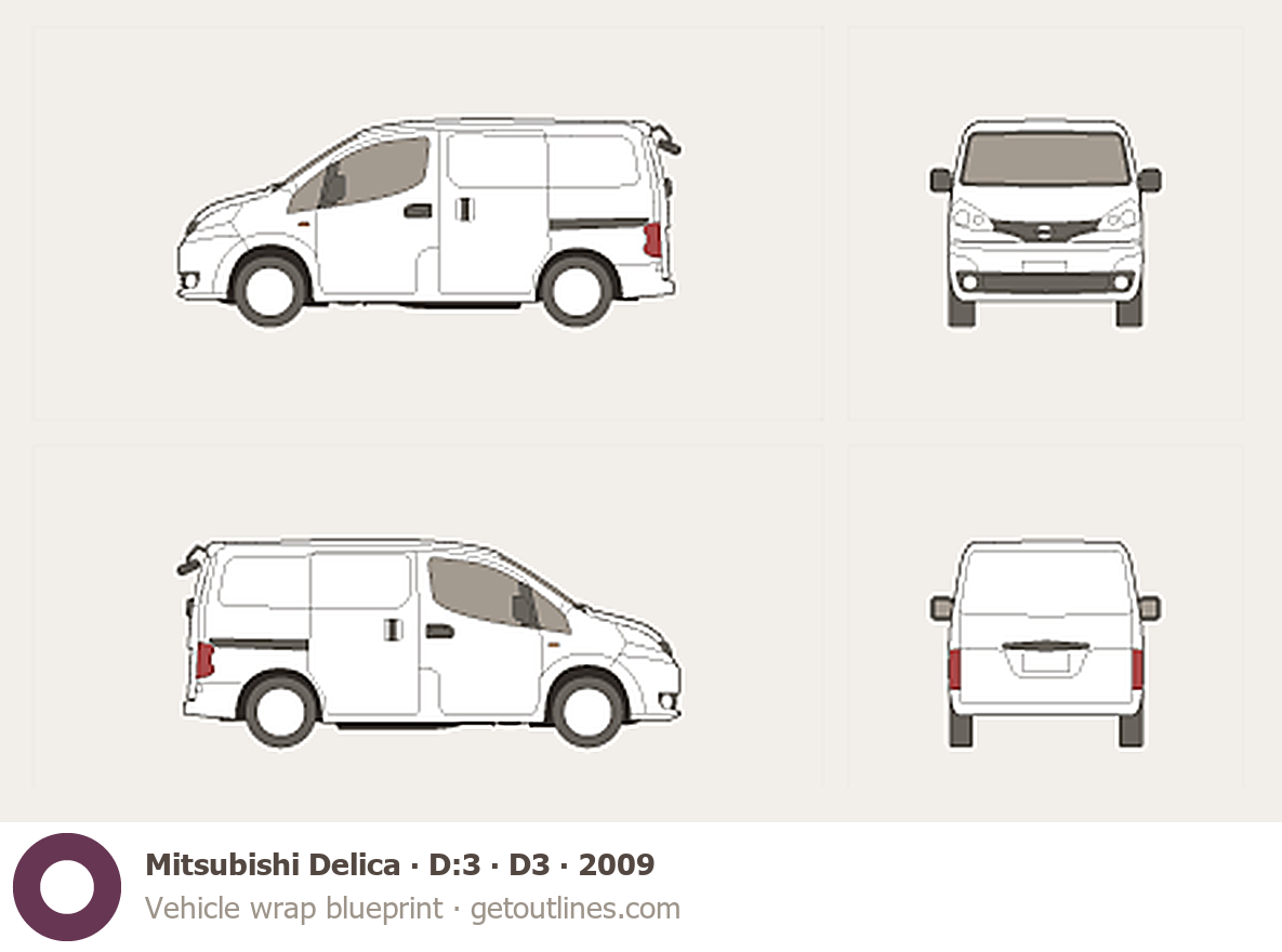 This 2009 Mitsubishi Delica D:3 D3 Wagon blueprint helps designers, wrap studios, and 3D artists simplify their workflow and save valuable time for creative work instead of routine tasks.