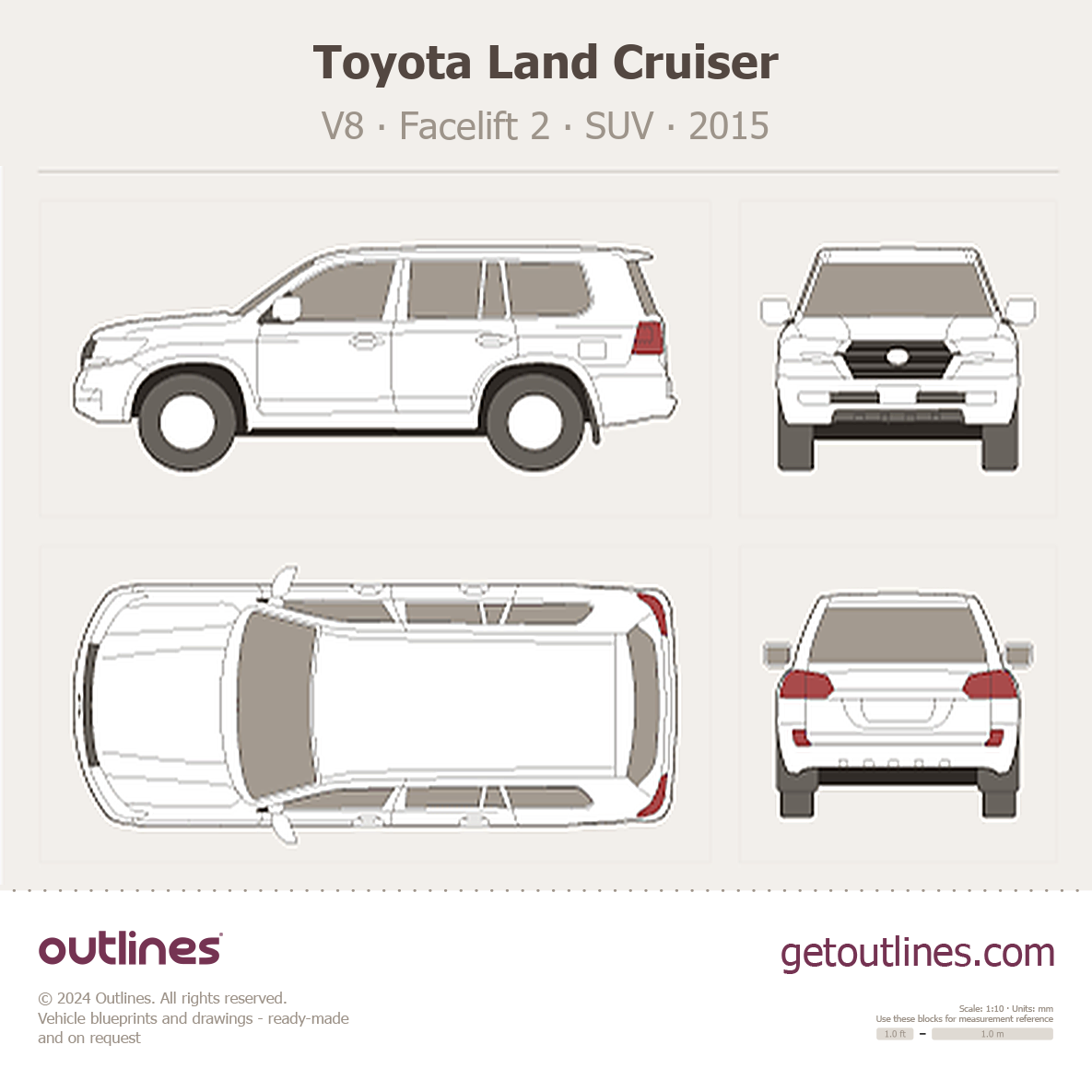 This is a blueprint of the Land Cruiser, produced by carmaker Toyota in 2015 - Present (2025, 2026). It features a SUV body design and is classified as a Offroad vehicle.