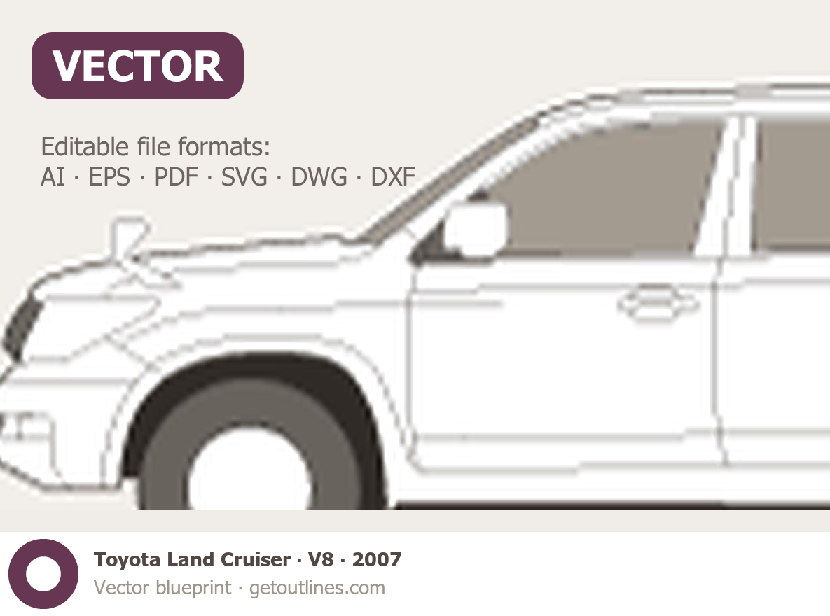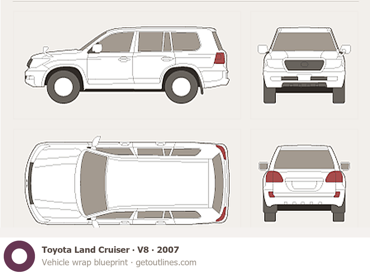 This 2007 Toyota Land Cruiser V8 SUV blueprint helps designers, wrap studios, and 3D artists simplify their workflow and save valuable time for creative work instead of routine tasks.