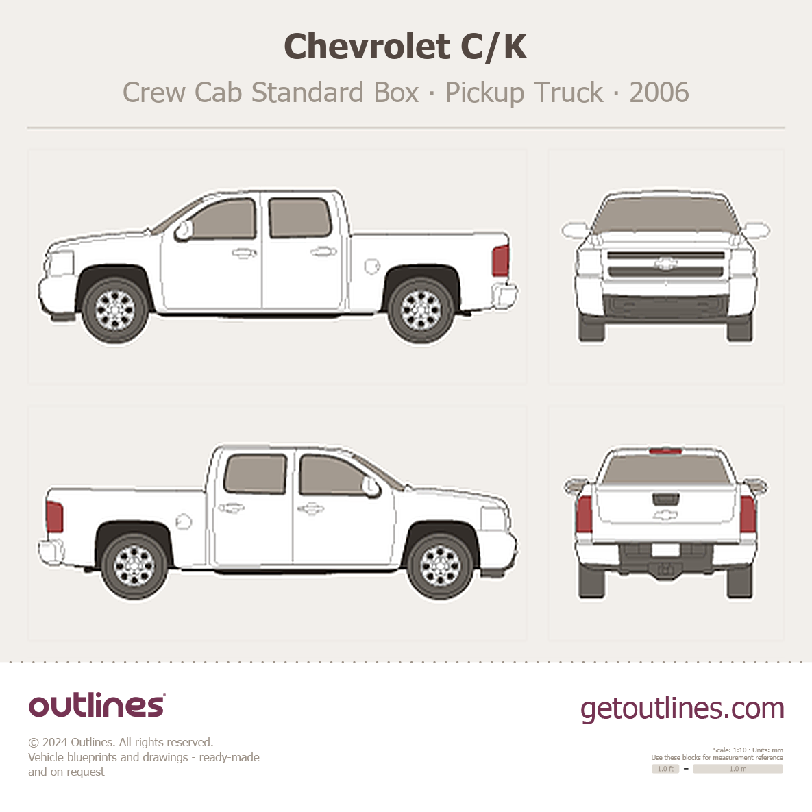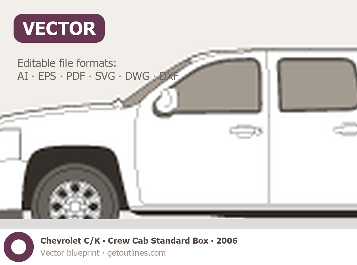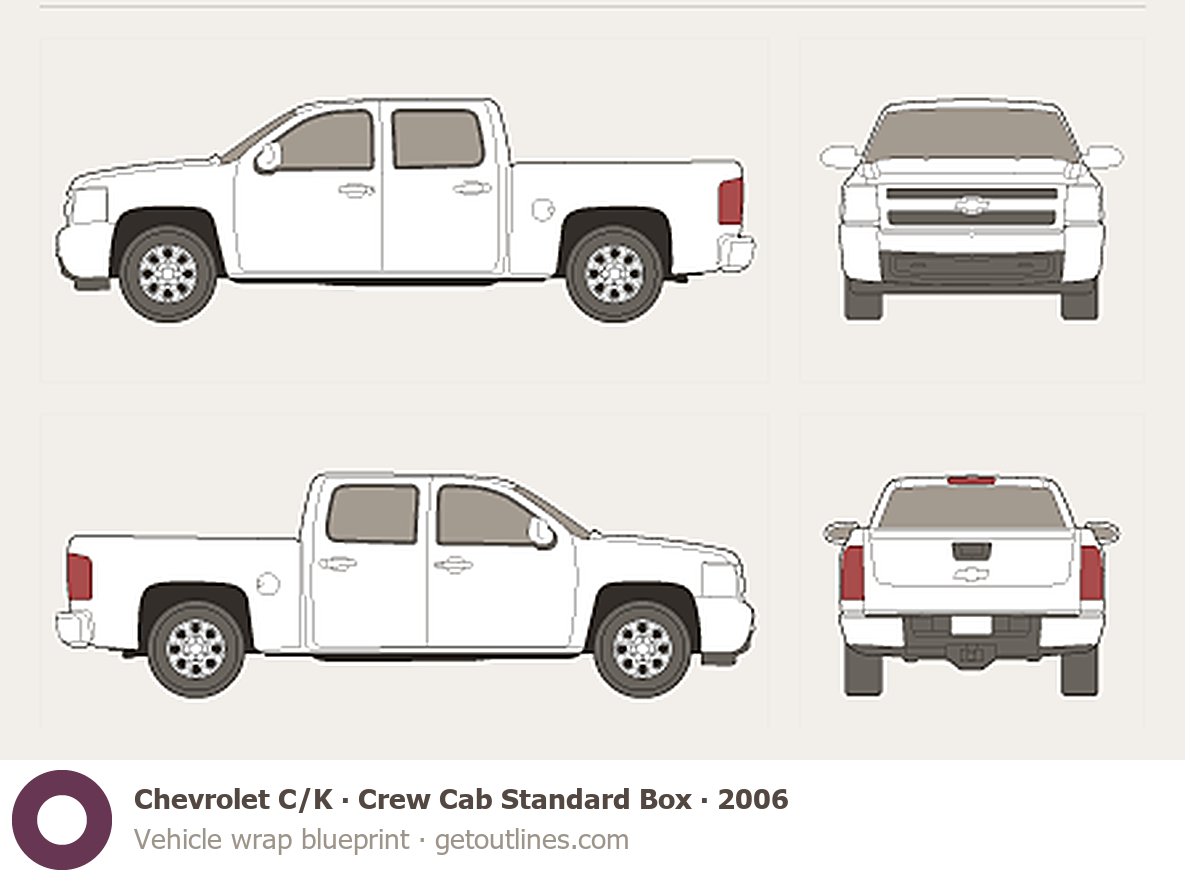 This 2006 Chevrolet C/K Crew Cab Standard Box Pickup Truck blueprint helps designers, wrap studios, and 3D artists simplify their workflow and save valuable time for creative work instead of routine tasks.