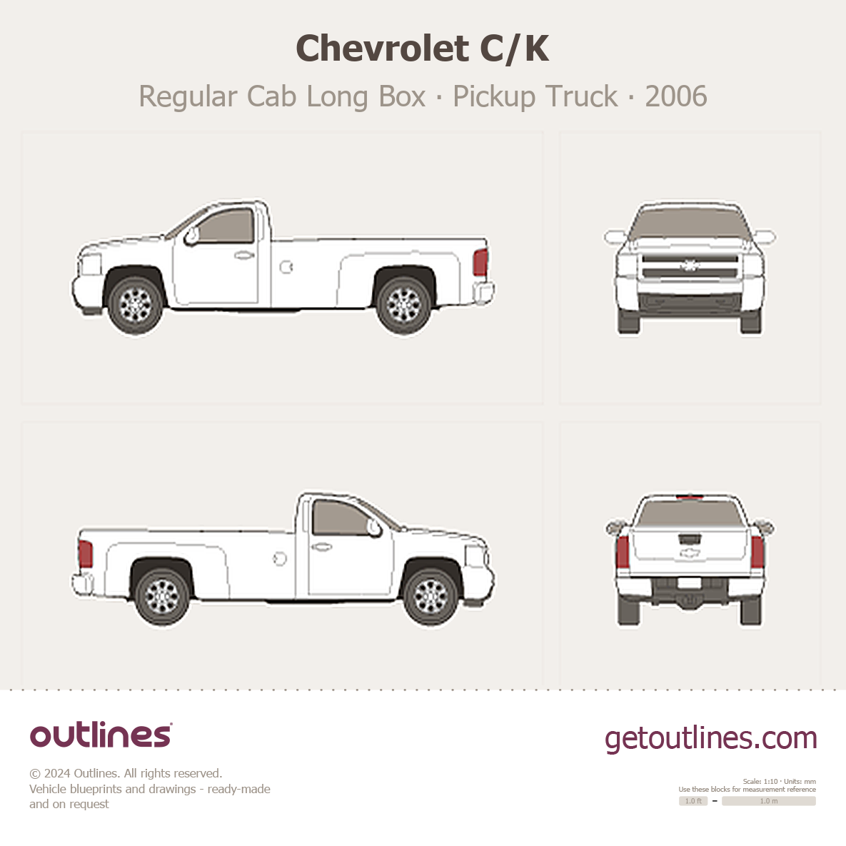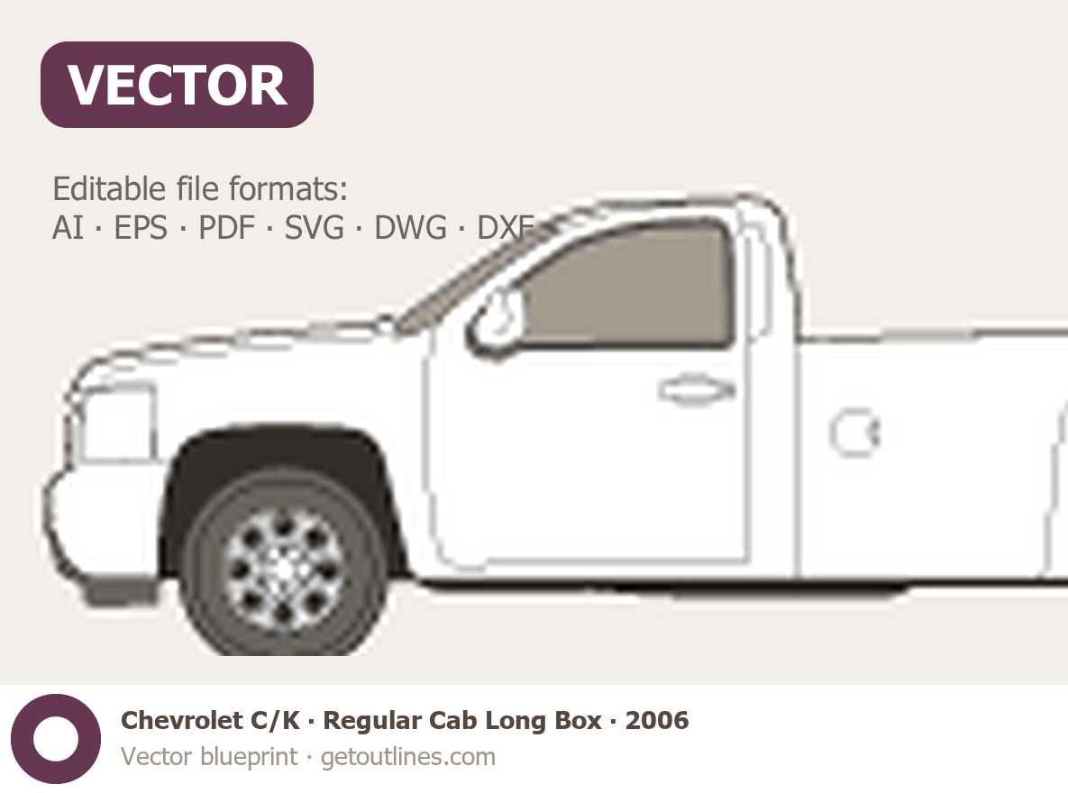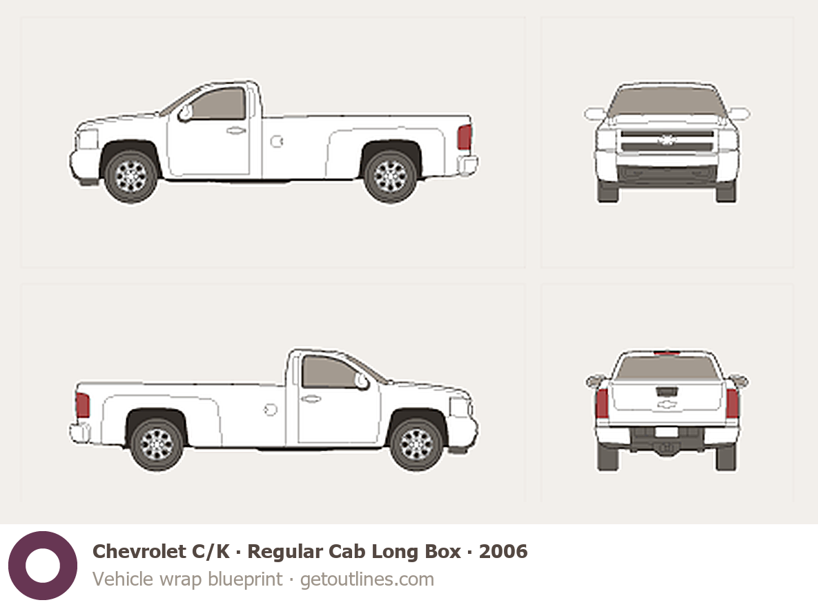 This 2006 Chevrolet C/K Regular Cab Long Box Pickup Truck blueprint helps designers, wrap studios, and 3D artists simplify their workflow and save valuable time for creative work instead of routine tasks.