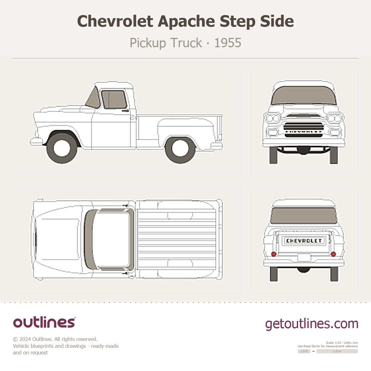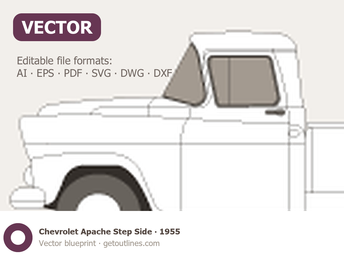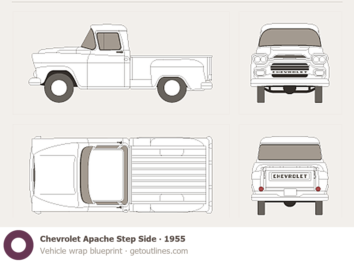 This 1955 Chevrolet Apache Step Side Pickup Truck blueprint helps designers, wrap studios, and 3D artists simplify their workflow and save valuable time for creative work instead of routine tasks.
