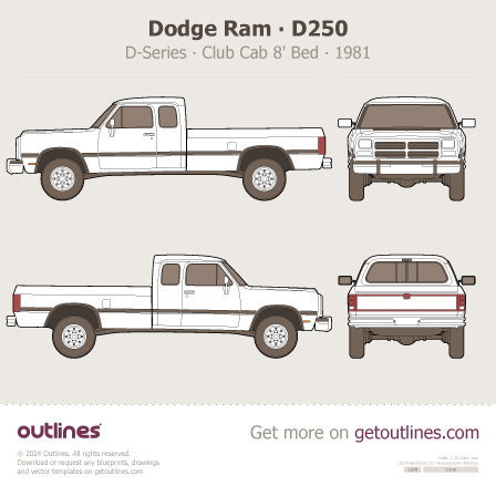 This 1981 Dodge Ram D250 Club Cab 8' ∙ D/W Pickup Truck blueprint helps designers, wrap studios, and 3D artists simplify their workflow and save valuable time for creative work instead of routine tasks.
