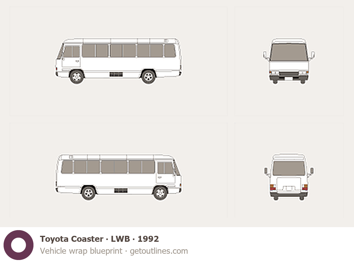 This template is suitable for Toyota Coaster models from 1992 to 2016, including 1992, 1993, 1994, 1995, and 2016 model years, and is commonly used for vehicle wrap and signage design.