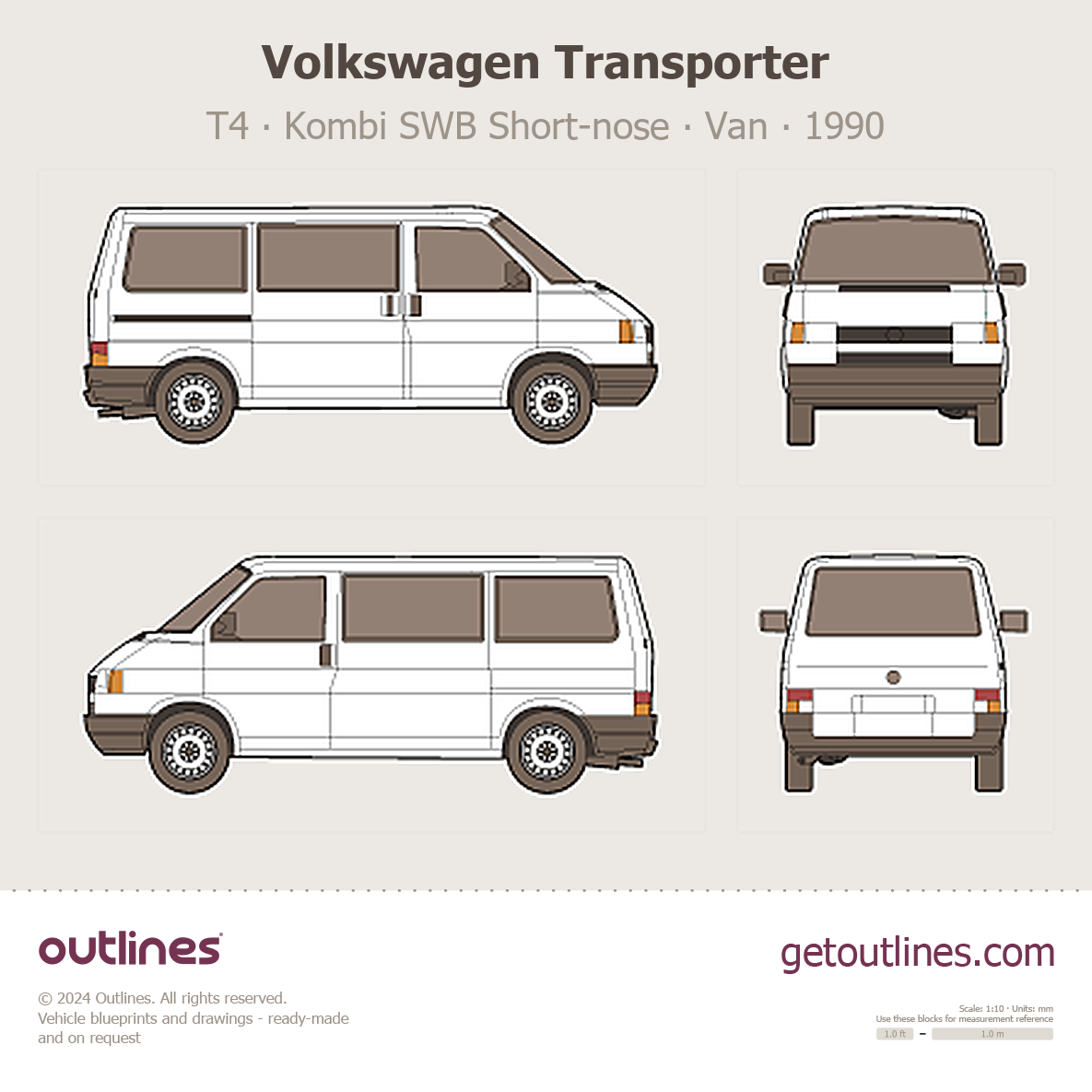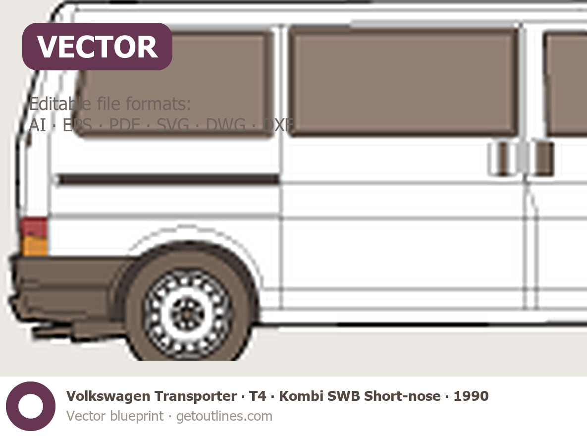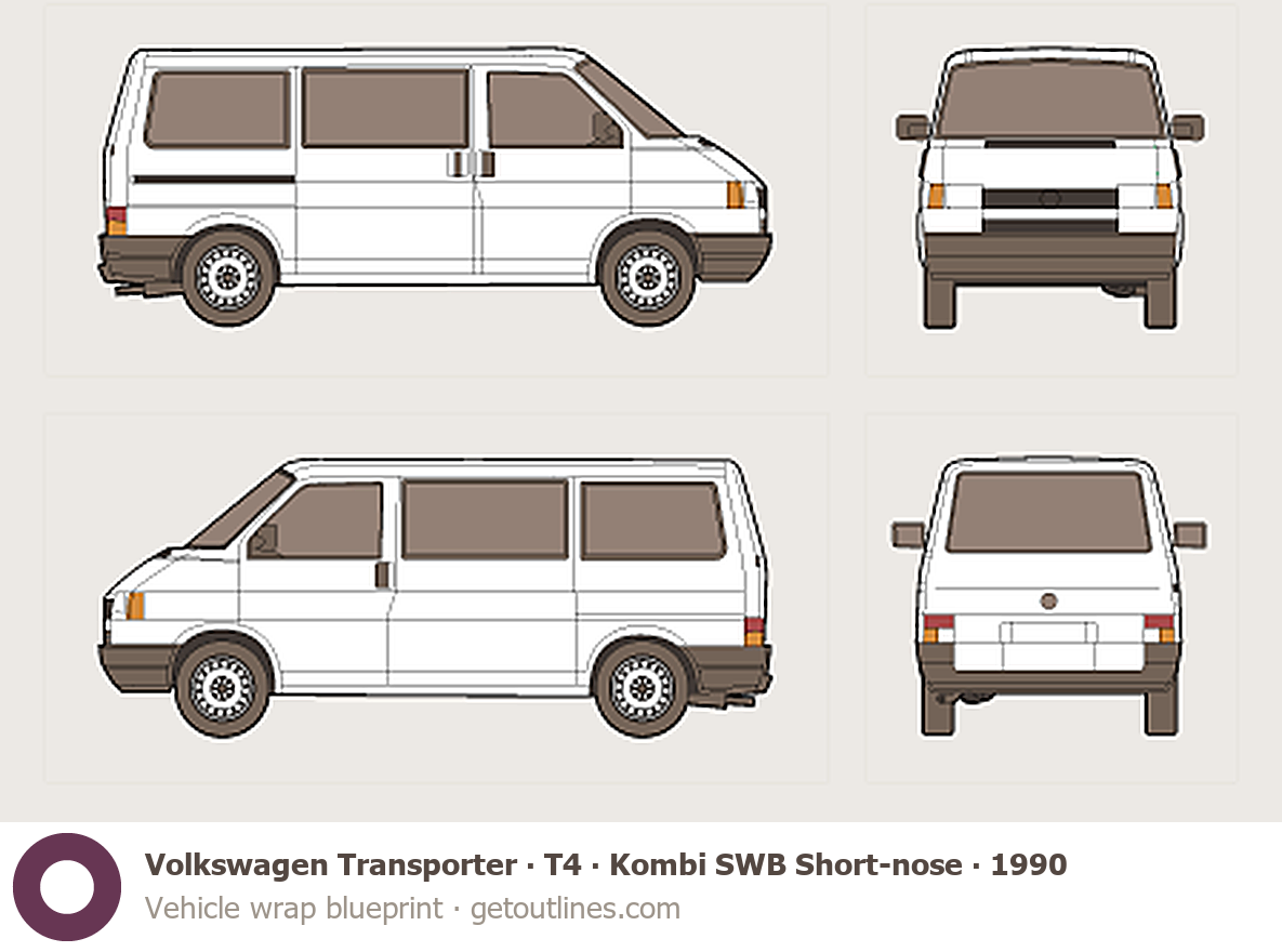 This 1990 Volkswagen Transporter T4 Kombi SWB Short-nose Van blueprint helps designers, wrap studios, and 3D artists simplify their workflow and save valuable time for creative work instead of routine tasks.