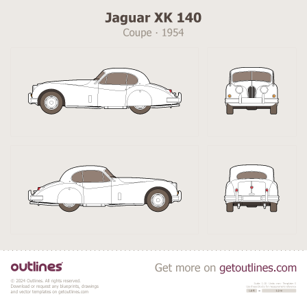 Buy this Jaguar XK 140 blueprint and line drawing in high-quality editable vector file formats. Best for 3D and car wrap design.