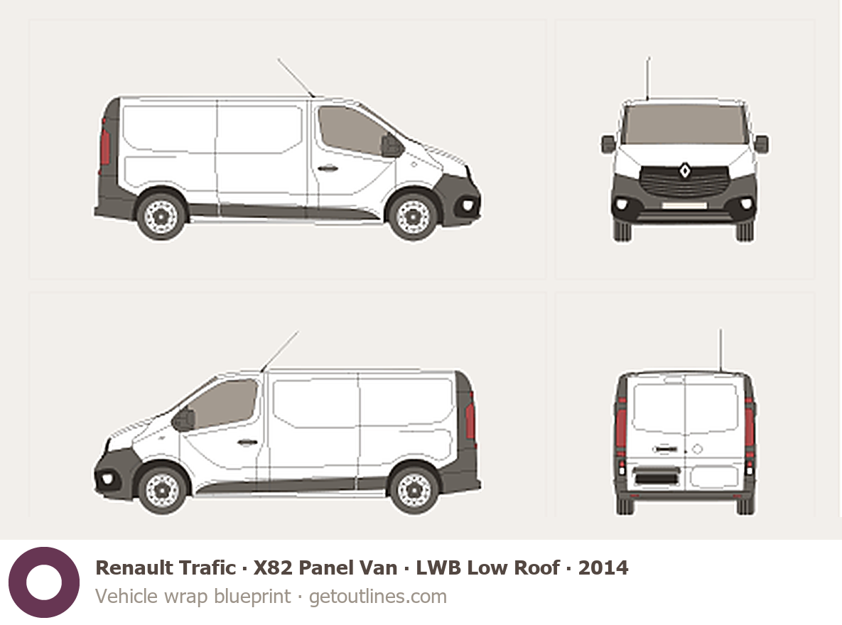 This 2014 Renault Trafic X82 Panel Van LWB Low Roof Van blueprint helps designers, wrap studios, and 3D artists simplify their workflow and save valuable time for creative work instead of routine tasks.