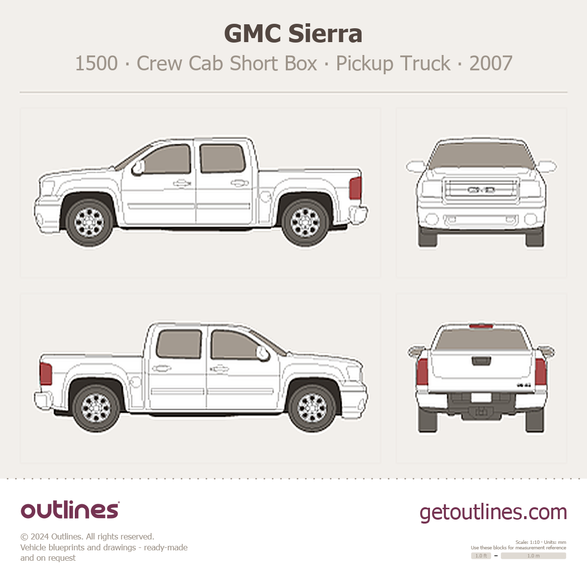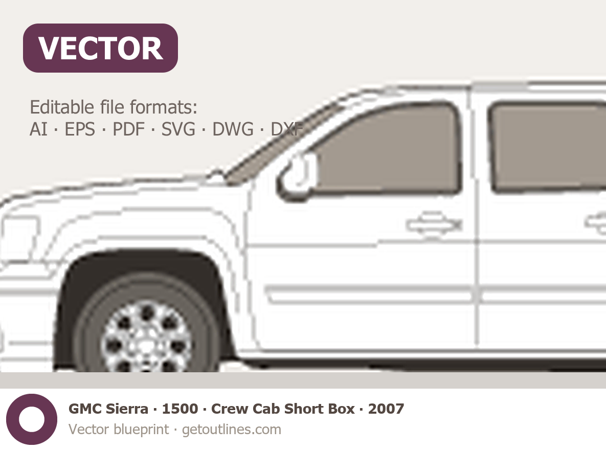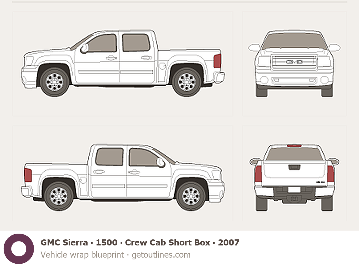 This 2007 GMC Sierra 1500 Crew Cab Short Box Pickup Truck blueprint helps designers, wrap studios, and 3D artists simplify their workflow and save valuable time for creative work instead of routine tasks.