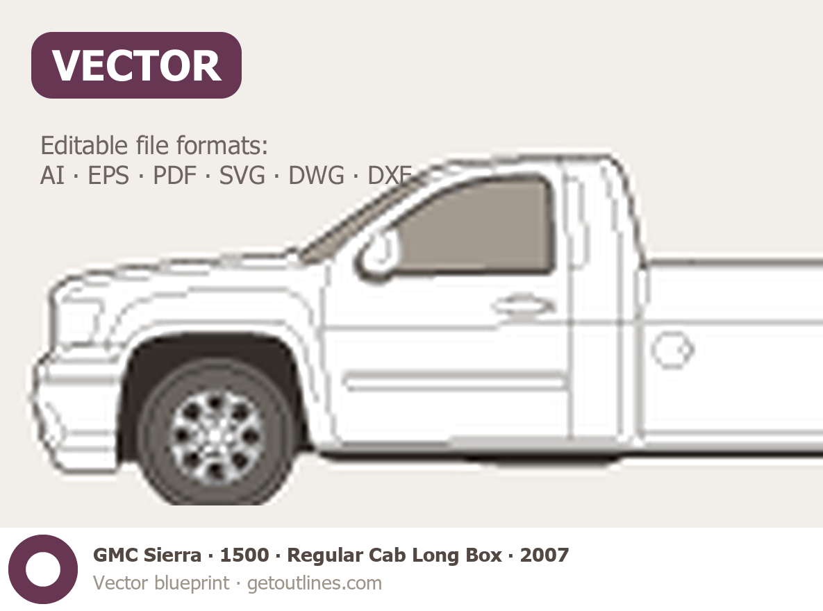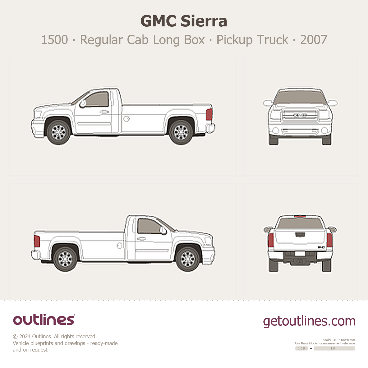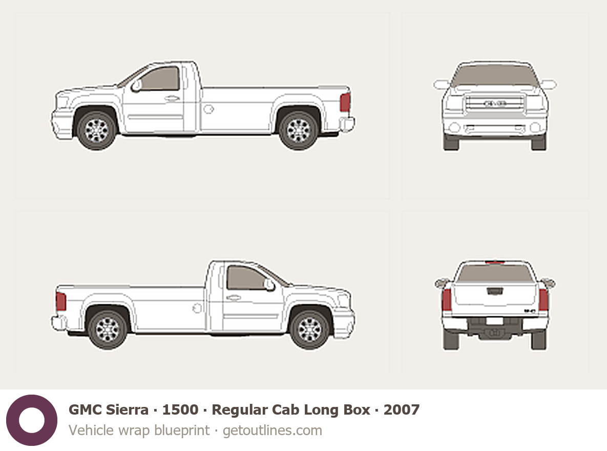 This 2007 GMC Sierra 1500 Regular Cab Long Box Pickup Truck blueprint helps designers, wrap studios, and 3D artists simplify their workflow and save valuable time for creative work instead of routine tasks.
