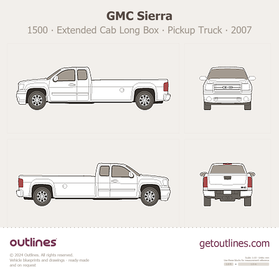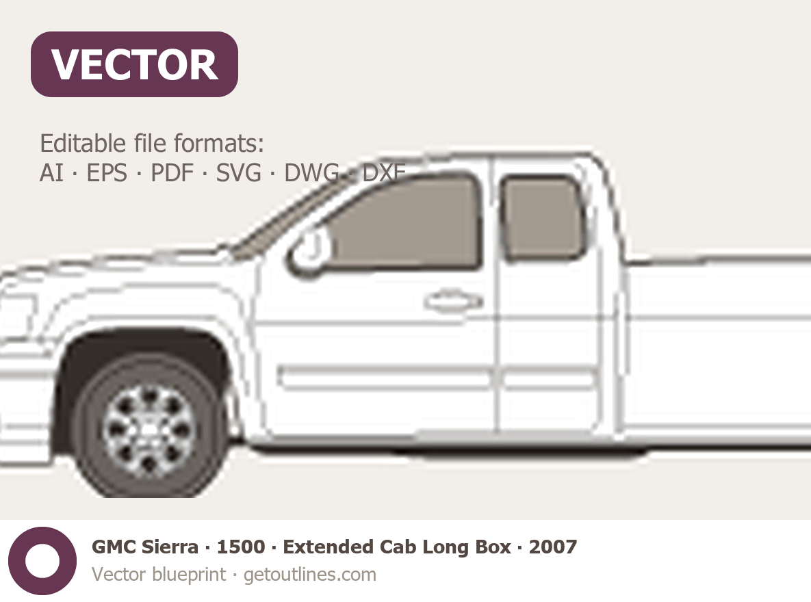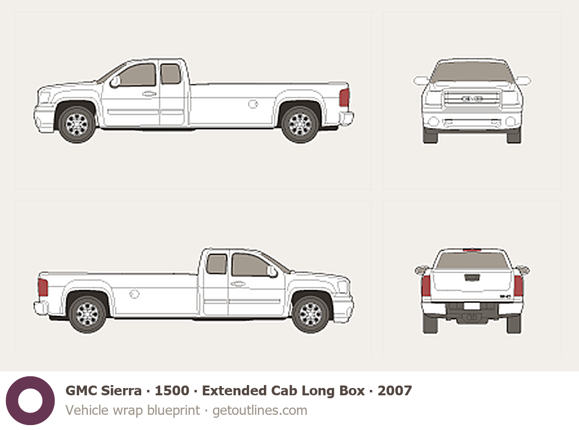 This 2007 GMC Sierra 1500 Extended Cab Long Box Pickup Truck blueprint helps designers, wrap studios, and 3D artists simplify their workflow and save valuable time for creative work instead of routine tasks.
