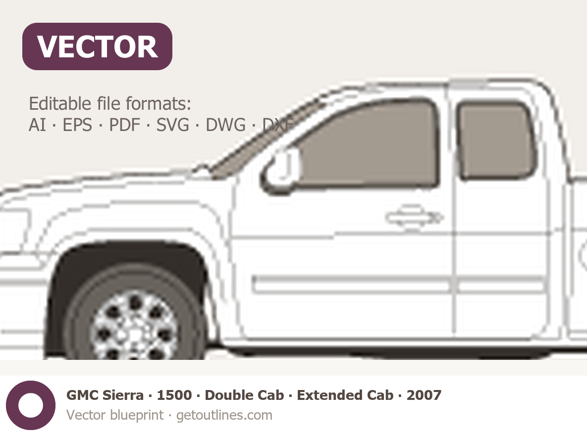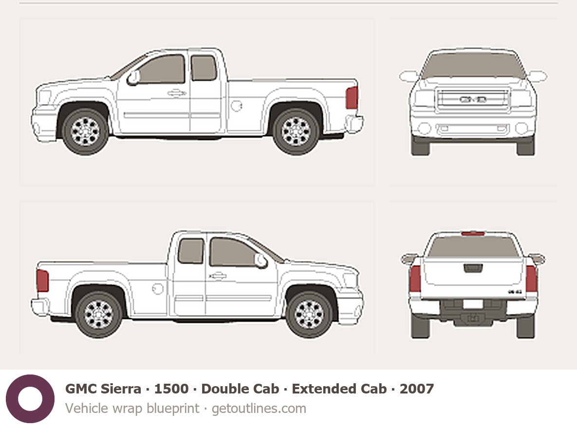 This 2007 GMC Sierra 1500 Double Cab ∙ Extended Cab Pickup Truck blueprint helps designers, wrap studios, and 3D artists simplify their workflow and save valuable time for creative work instead of routine tasks.