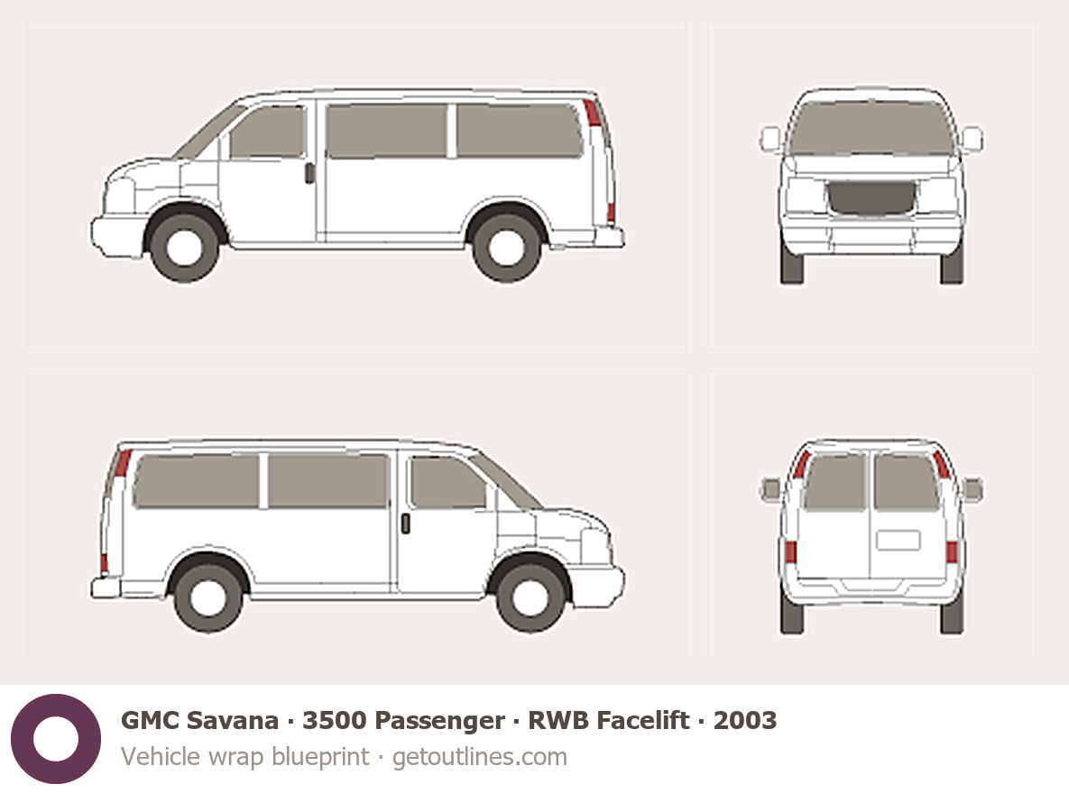 This 2003 GMC Savana 3500 Passenger RWB Facelift Van blueprint helps designers, wrap studios, and 3D artists simplify their workflow and save valuable time for creative work instead of routine tasks.