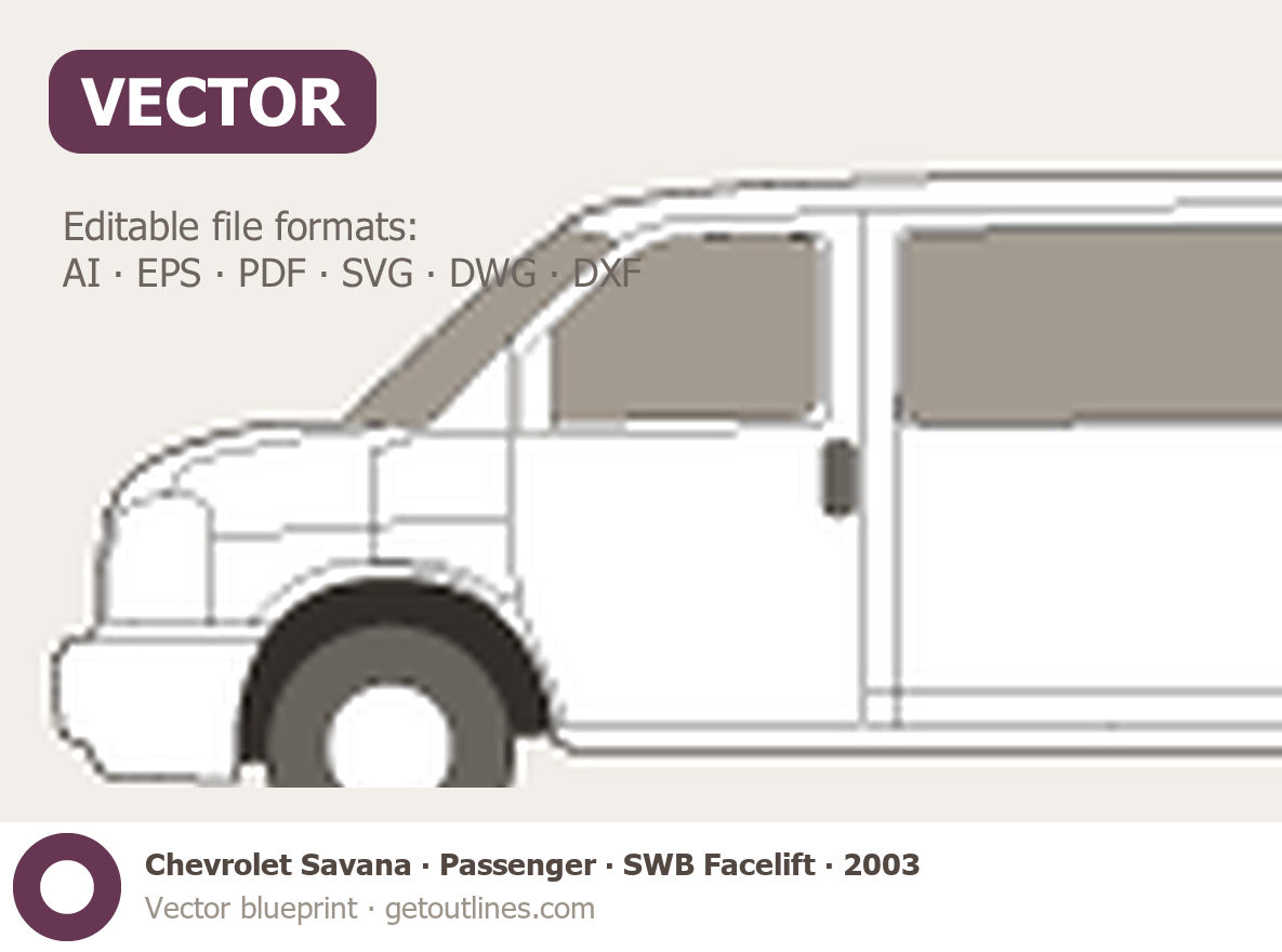 This 2003 Chevrolet Savana Passenger SWB Facelift Wagon blueprint helps designers, wrap studios, and 3D artists simplify their workflow and save valuable time for creative work instead of routine tasks.