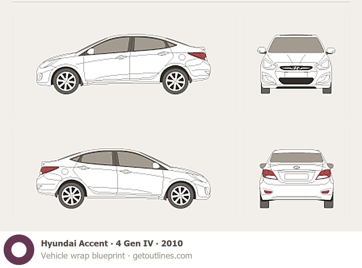 This 2010 Hyundai Accent 4 Gen IV Sedan blueprint helps designers, wrap studios, and 3D artists simplify their workflow and save valuable time for creative work instead of routine tasks.