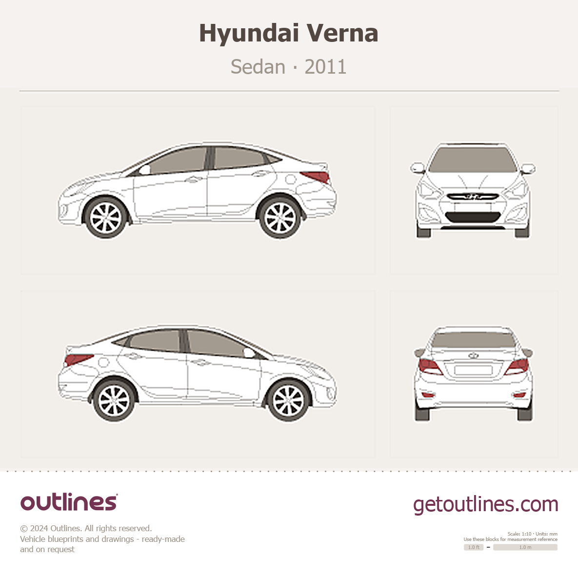 This is a blueprint of the Verna, produced by carmaker Hyundai in 2011 - 2014. It features a Sedan body design and is classified as a Family vehicle.