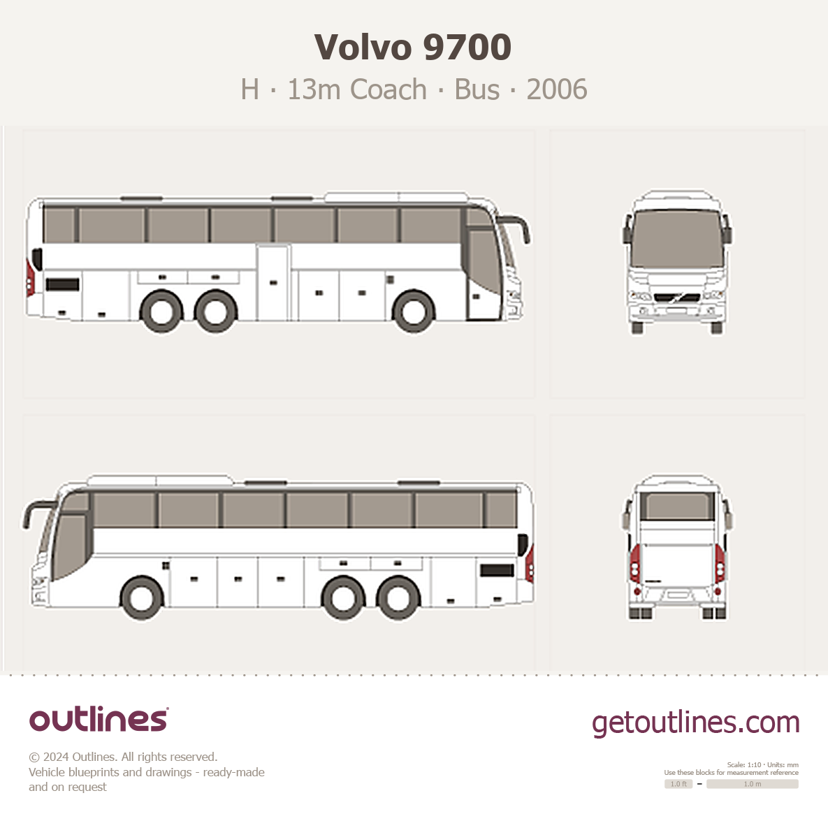 This is a blueprint of the 9700, produced by carmaker Volvo in 2006 - 2013. It features a Bus body design and is classified as a Commercial vehicle.