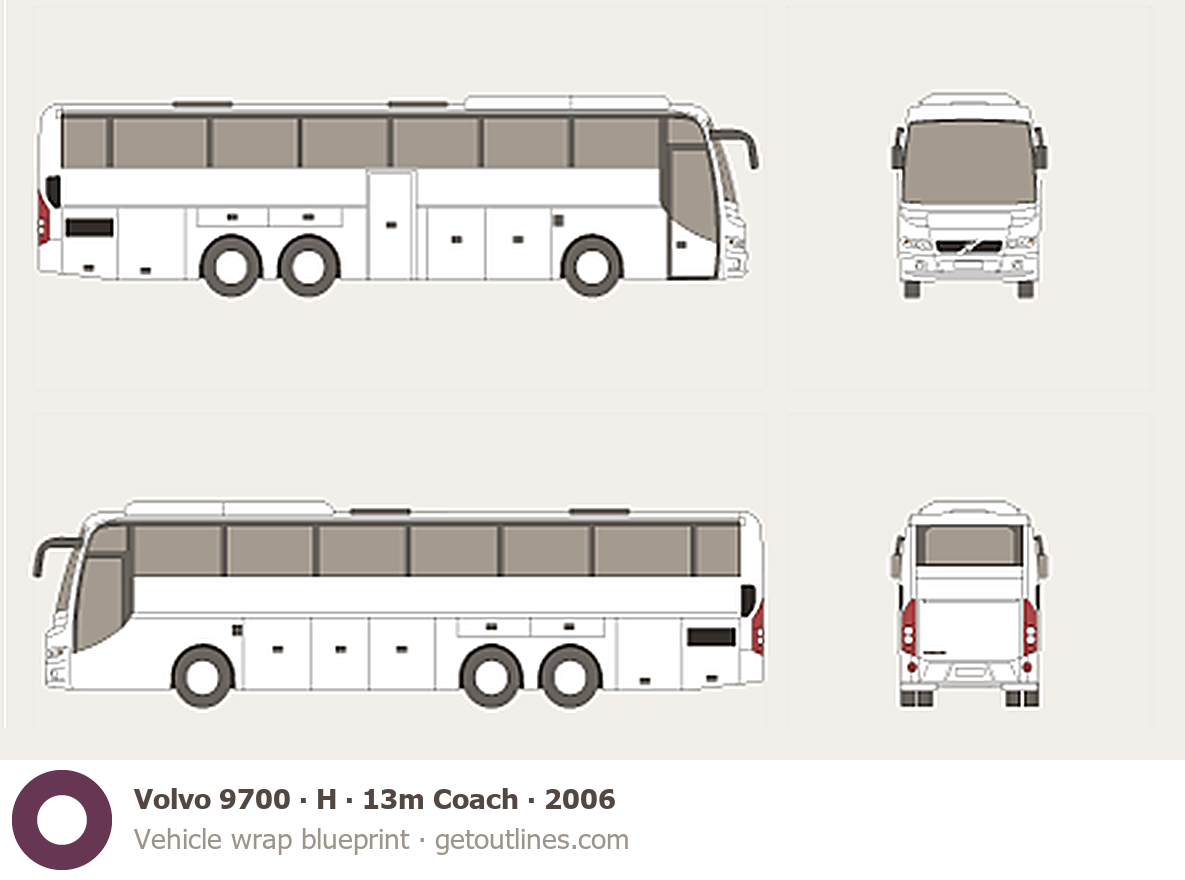 This 2006 Volvo 9700 H 13m Coach Bus blueprint helps designers, wrap studios, and 3D artists simplify their workflow and save valuable time for creative work instead of routine tasks.