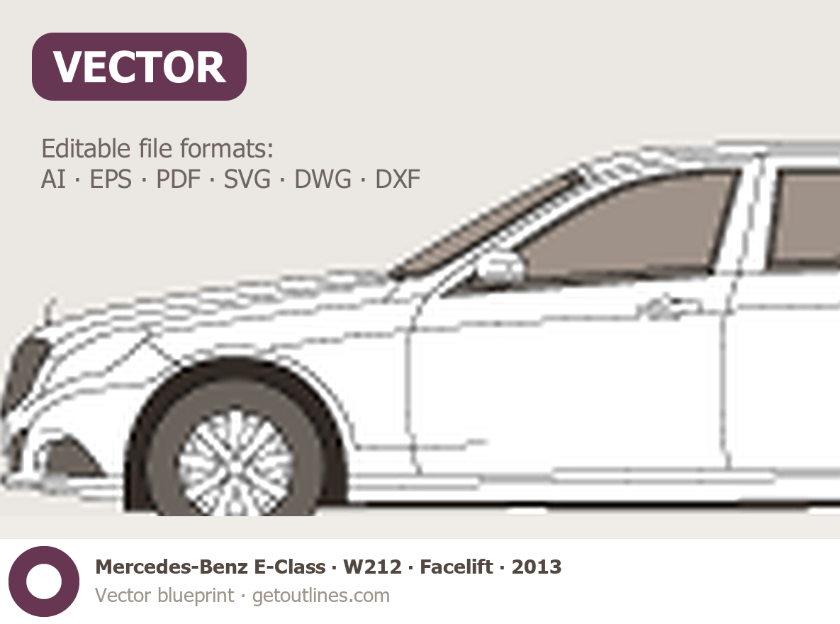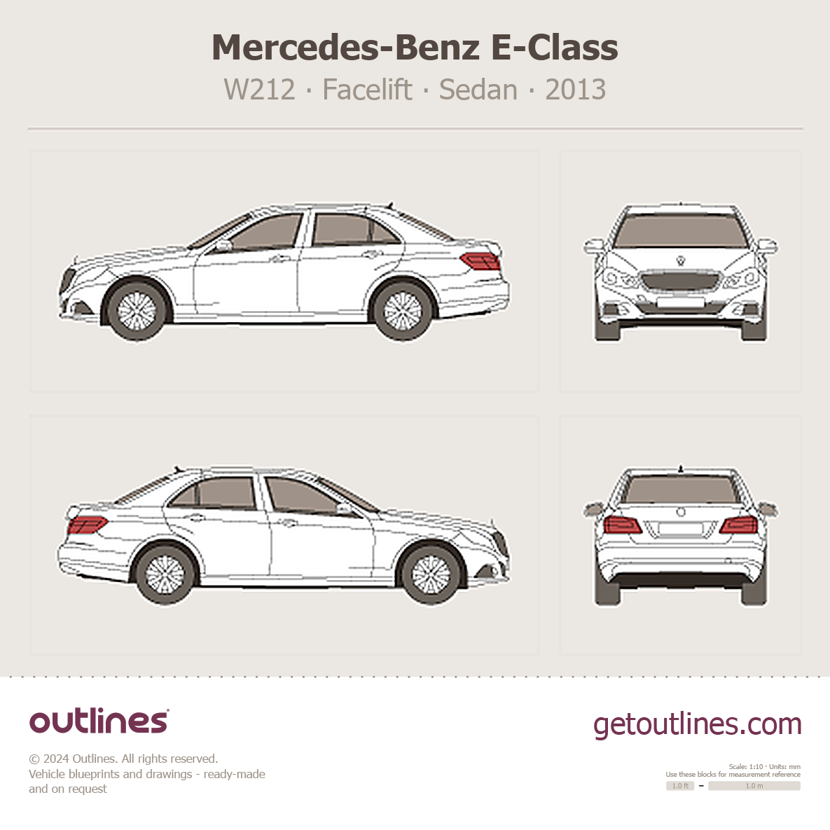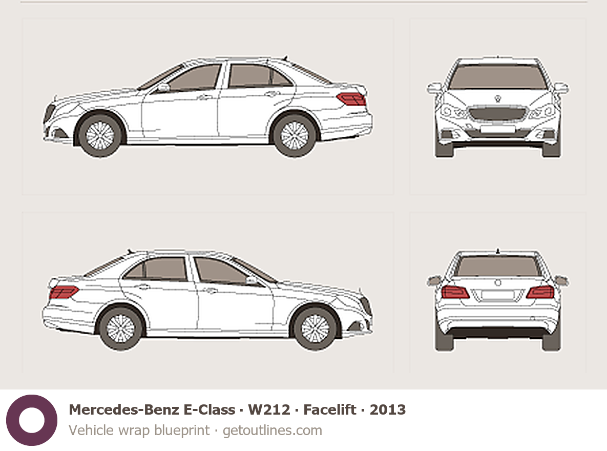 This 2013 Mercedes-Benz E-Class W212 Facelift Sedan blueprint helps designers, wrap studios, and 3D artists simplify their workflow and save valuable time for creative work instead of routine tasks.