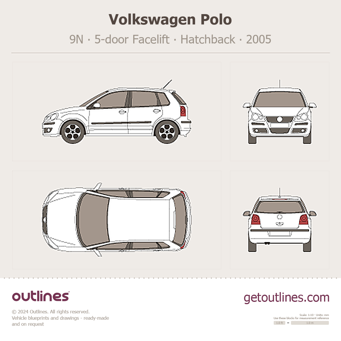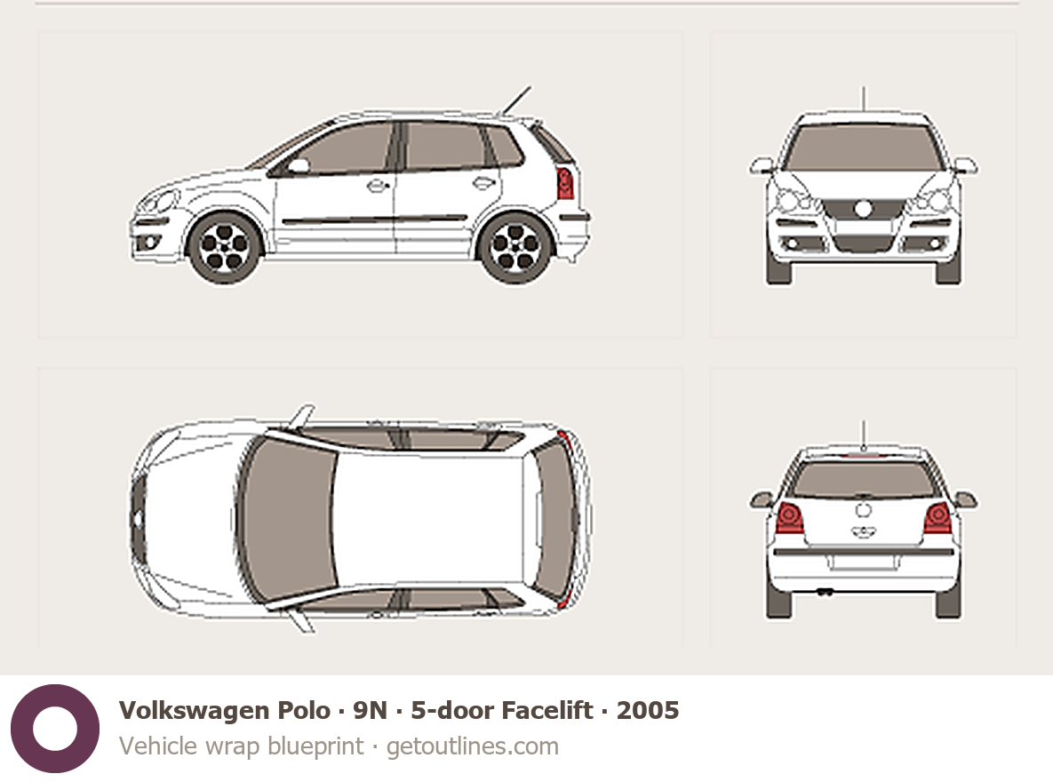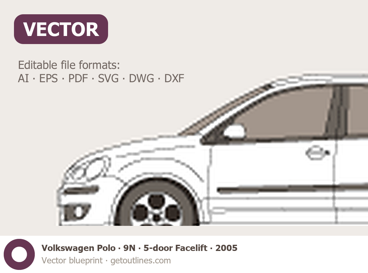 Buy this Volkswagen Polo 9N blueprint and line drawing in high-quality editable vector file formats. Best for 3D and car wrap design.