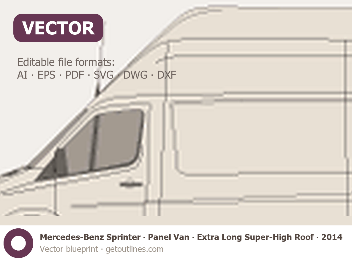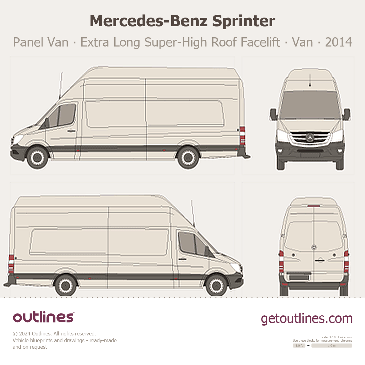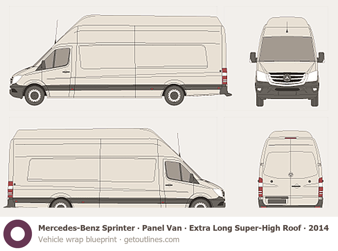 This 2014 Mercedes-Benz Sprinter Panel Van Extra Long Super-High Roof Facelift Van blueprint helps designers, wrap studios, and 3D artists simplify their workflow and save valuable time for creative work instead of routine tasks.