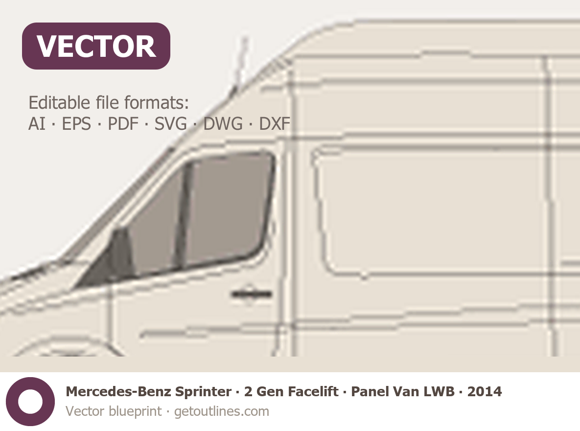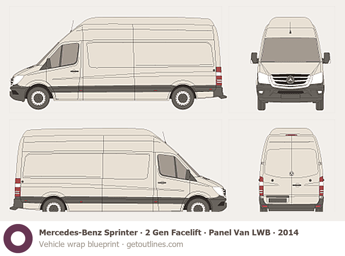 This 2014 Mercedes-Benz Sprinter 2 Gen Facelift Panel Van LWB Super-High Roof Van blueprint helps designers, wrap studios, and 3D artists simplify their workflow and save valuable time for creative work instead of routine tasks.