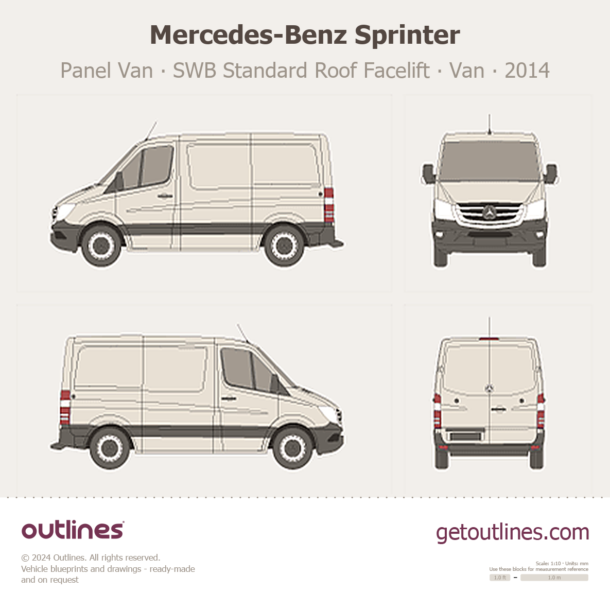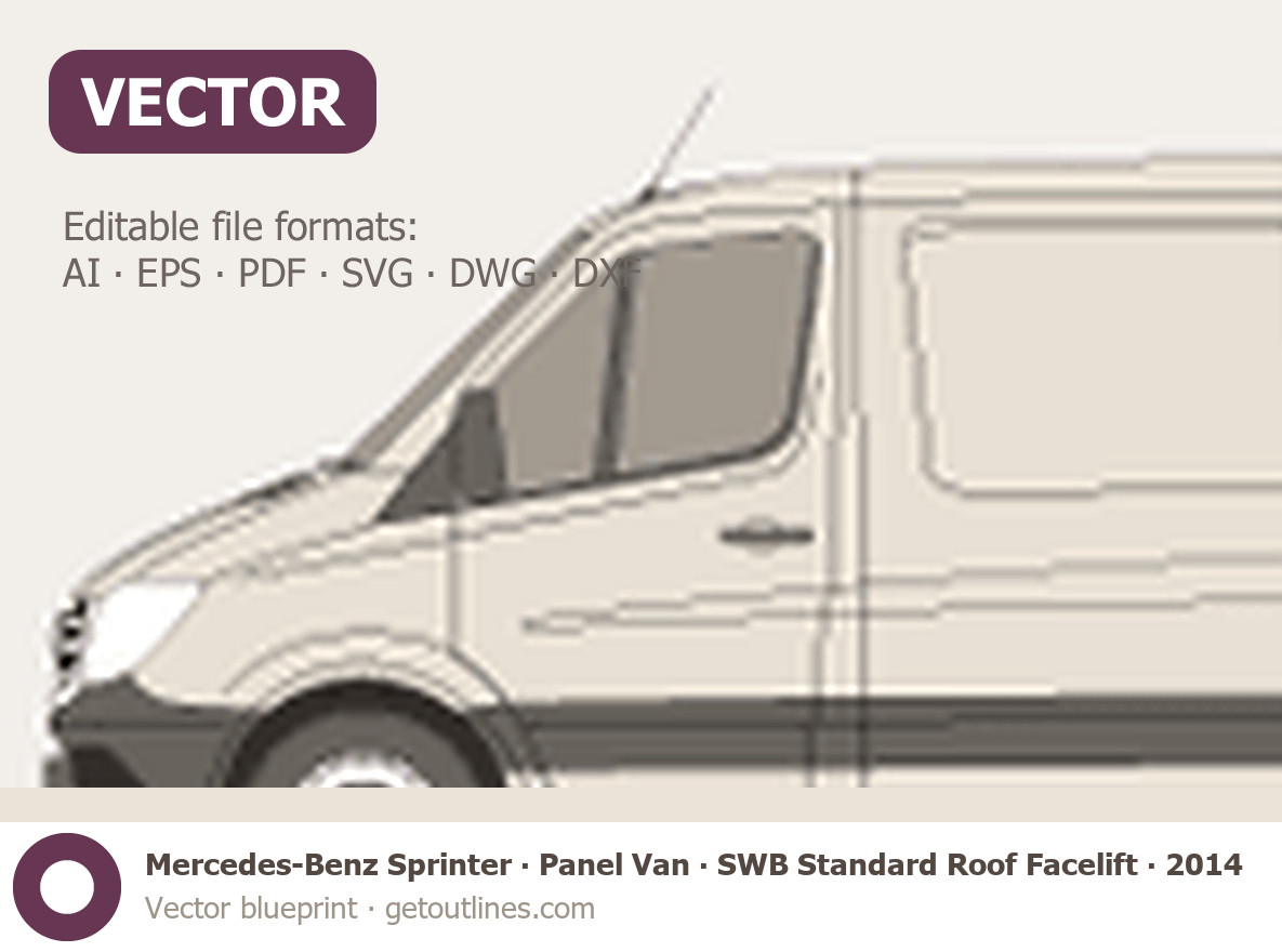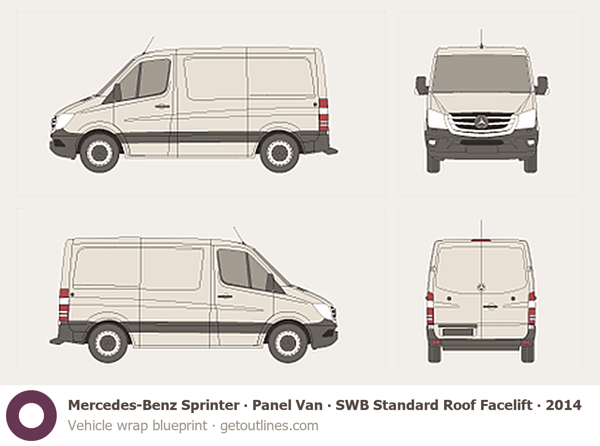 This 2014 Mercedes-Benz Sprinter Panel Van SWB Standard Roof Facelift Van blueprint helps designers, wrap studios, and 3D artists simplify their workflow and save valuable time for creative work instead of routine tasks.
