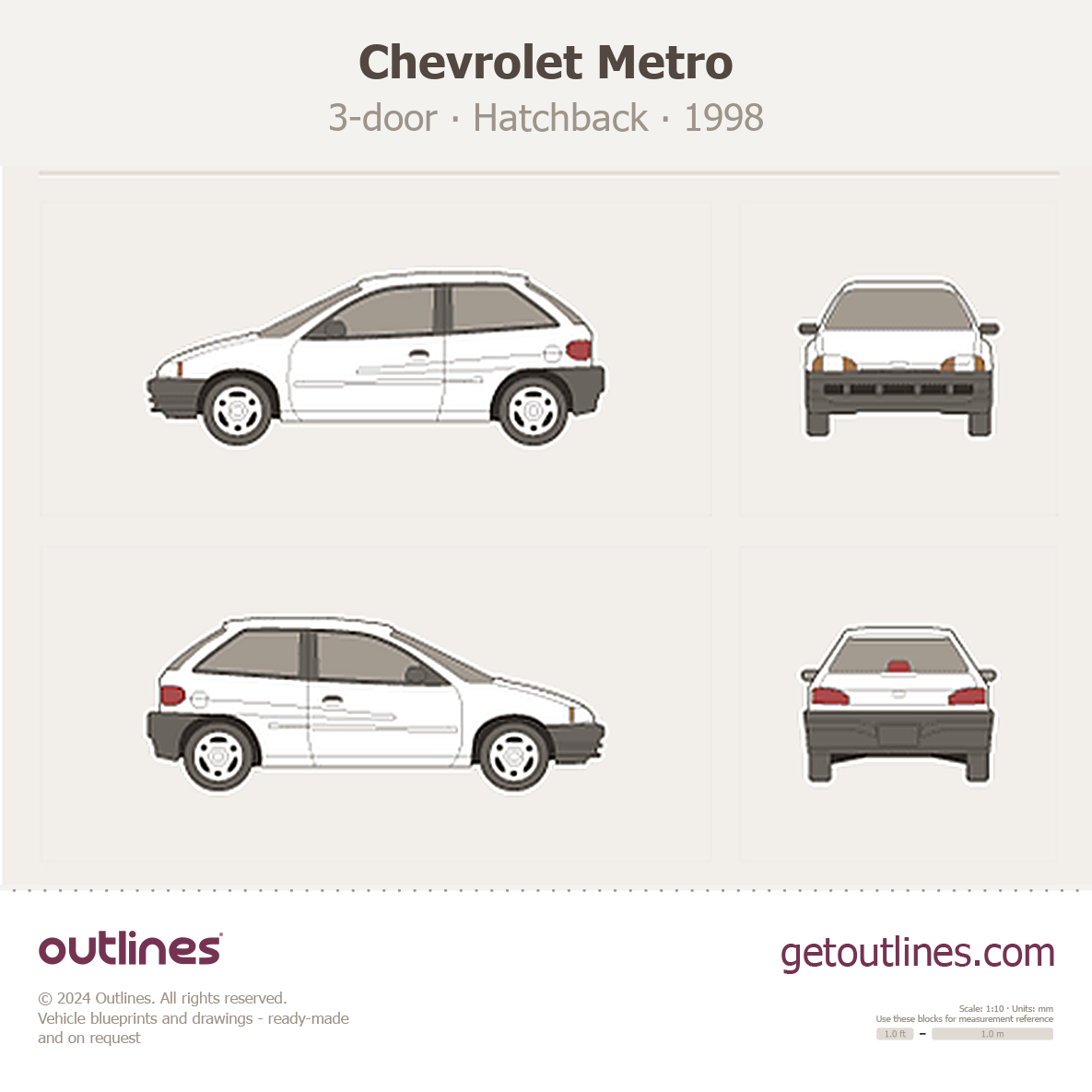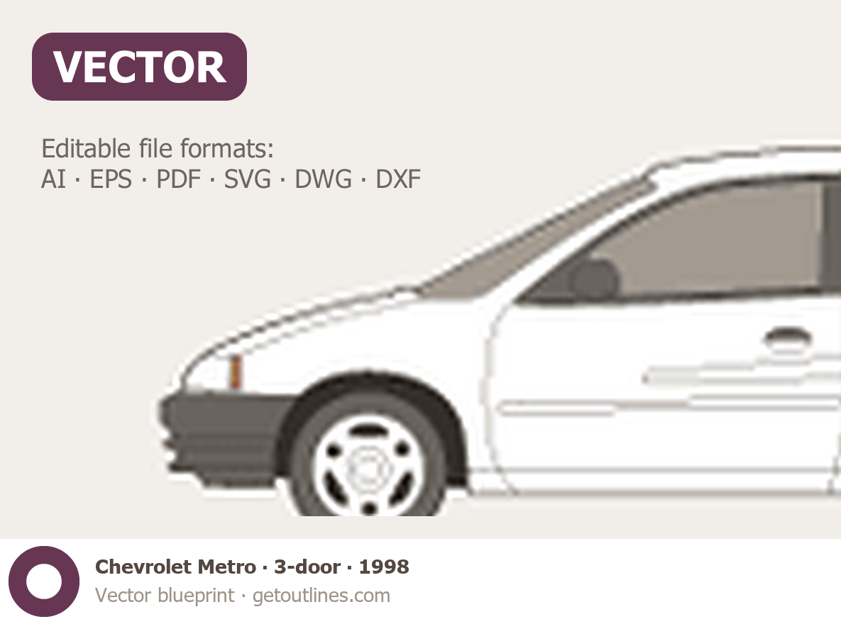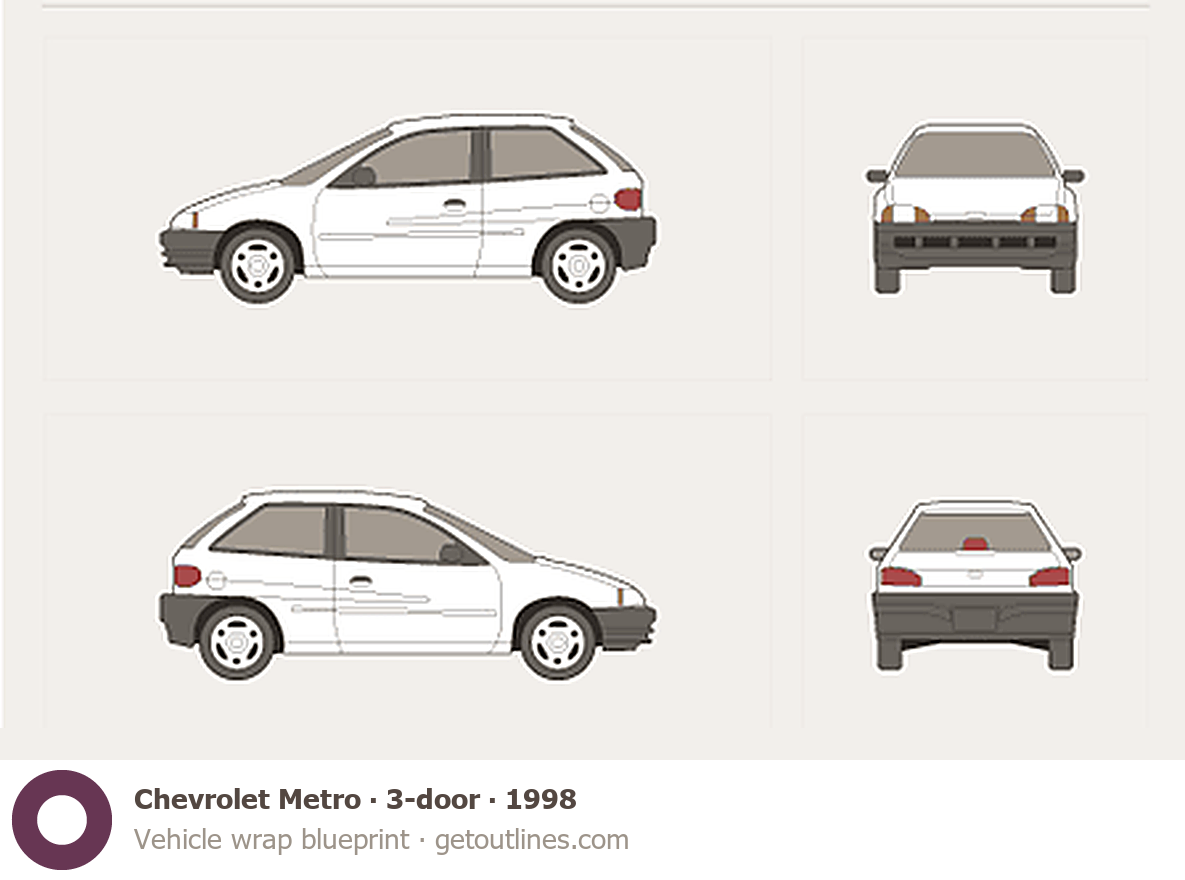 Buy this Chevrolet Metro blueprint and line drawing in high-quality editable vector file formats. Best for 3D and car wrap design.