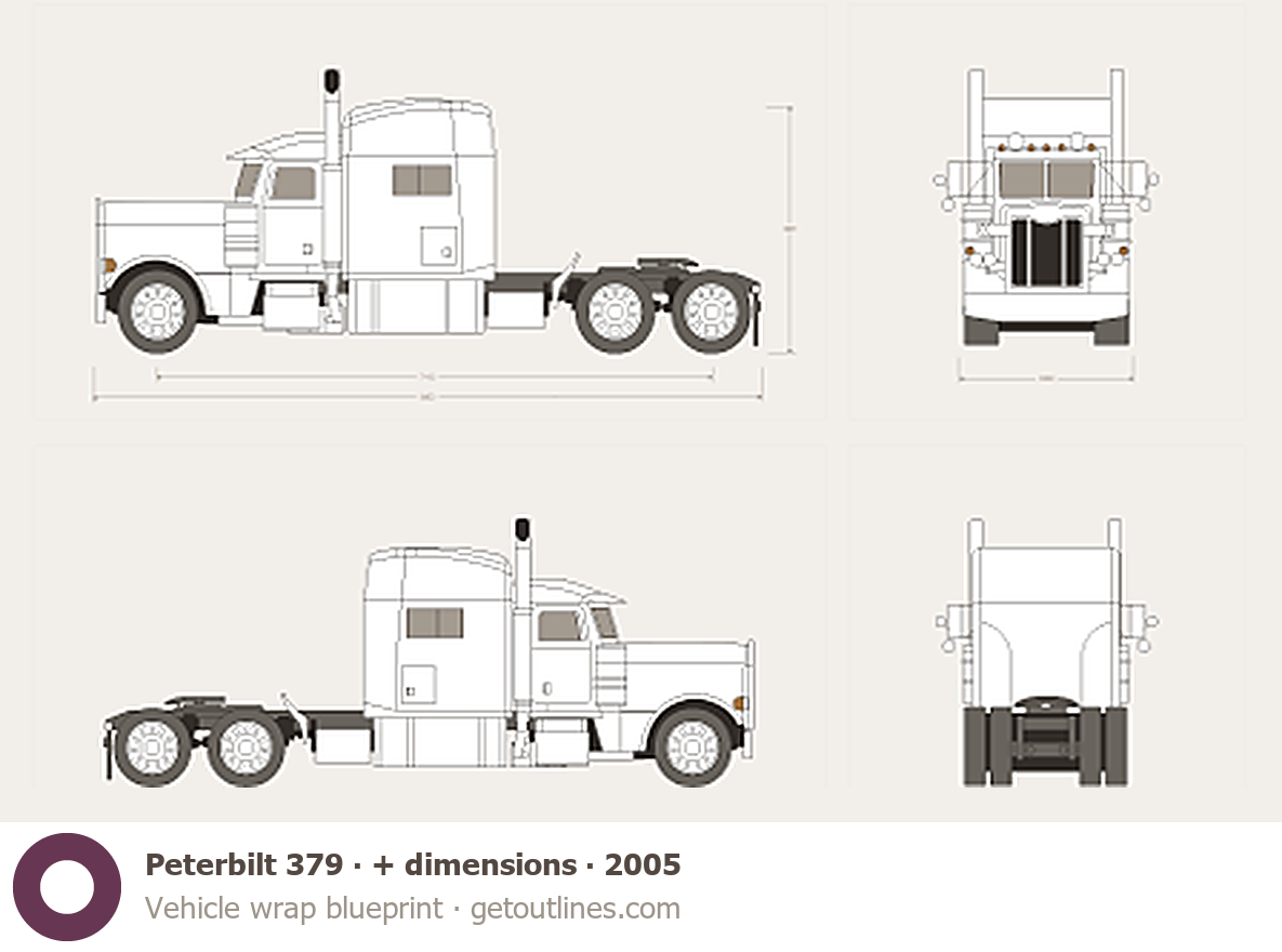 This 2005 Peterbilt 379 + dimensions Heavy Truck blueprint helps designers, wrap studios, and 3D artists simplify their workflow and save valuable time for creative work instead of routine tasks.